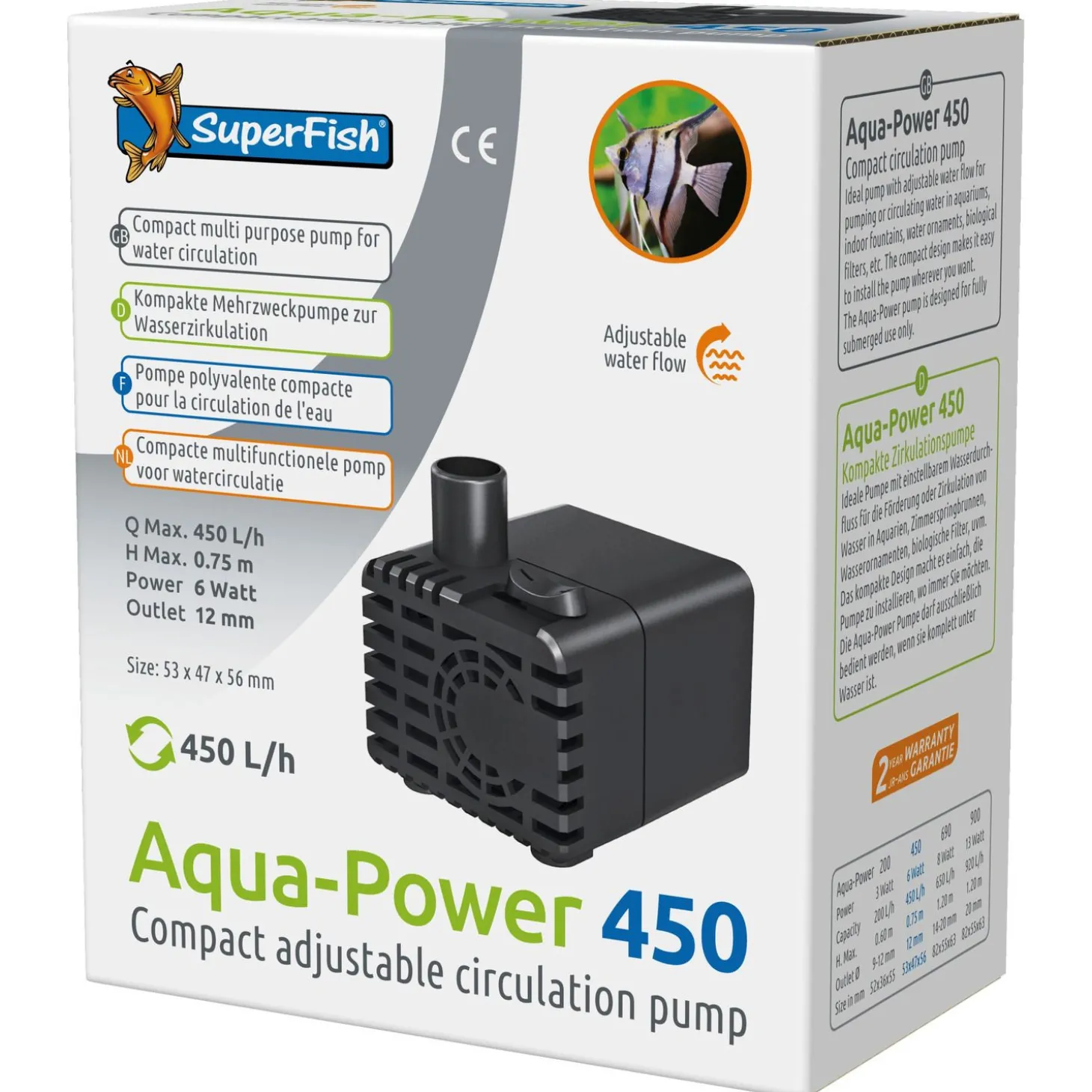 - Verbruik 6W, pompcapaciteit 450 L/h met een opvoerhoogte van 0,75m