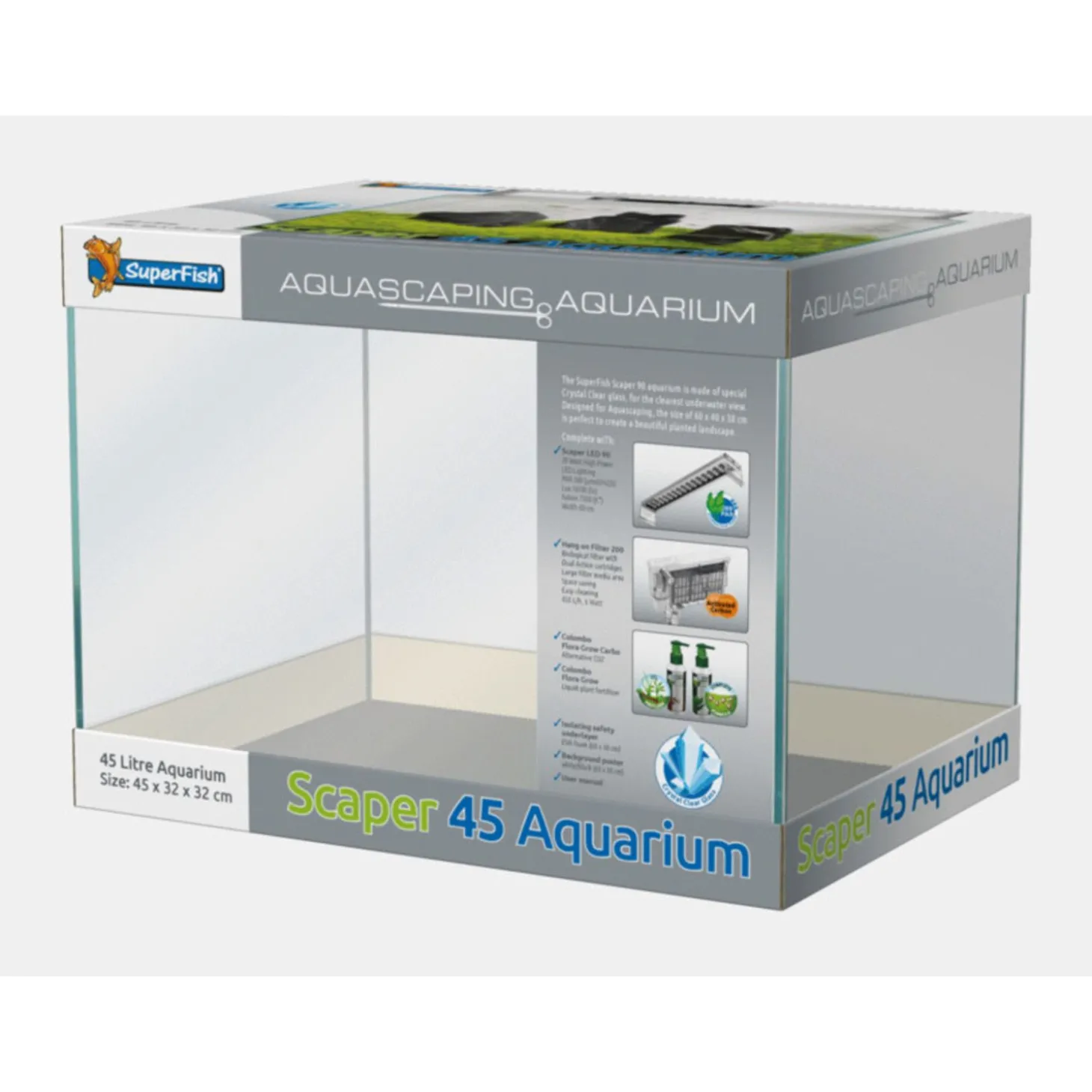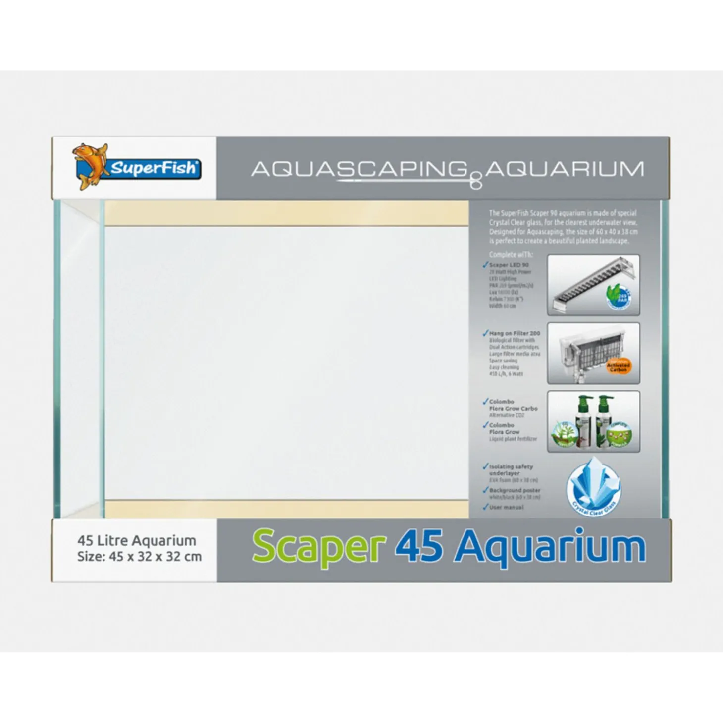 - Crystal Clear glas aquarium, inhoud 45 liter, vervang maandelijks de filtermedia in het hang on filter, vervangcartridges zijn verkrijgbaar bij uw dealer.