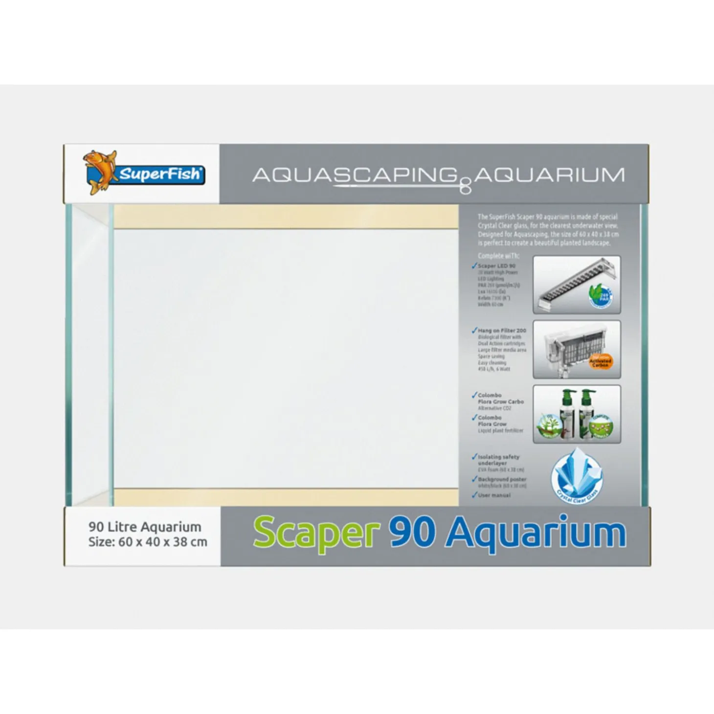 - Crystal Clear glas aquarium, inhoud 90 liter, vervang maandelijks de filtermedia in het hang on filter, vervangcartridges zijn verkrijgbaar bij uw dealer.