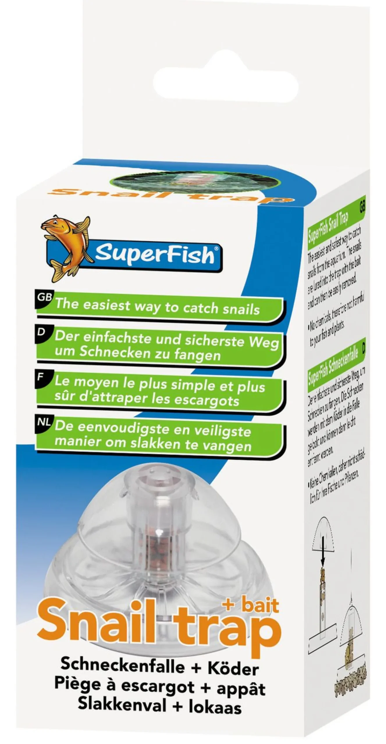 Een aantal slakken in het aquarium is handig omdat ze je aquarium schoon houden, maar als je niet op let kan je al gauw last krijgen van een slakkenplaag. De meest eenvoudige en veilige manier om slakken in je aquarium te vangen is met de Snail trap van Superfish. Met het bijgevoegde aas lok je slakken in de val, waarna je ze zelf eenvoudig kunt verwijderen om zo de slakkenpopulatie te verminderen. De vanger is gemaakt van kunststof .