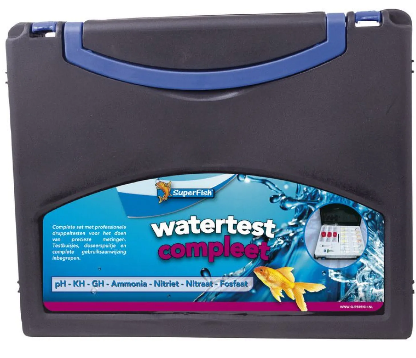 Het is belangrijk dat je de waardes van je vijver in de gaten houdt, zodat je zeker weet dat je vissen en planten zich in een gezonde omgeving bevinden. Met de Watertest Compleet van Superfish kan je eenvoudig je water testen. De koffer bevat nauwkeurige druppeltesten waarmee je alle relevante waardes kunt meten, zoals de pH-waarde, carbonaathardheid, totale hardheid en het fosfaat-, ammonia-, nitriet- en nitraatgehalte van het water. Zo heb je snel inzicht in je waterwaardes.