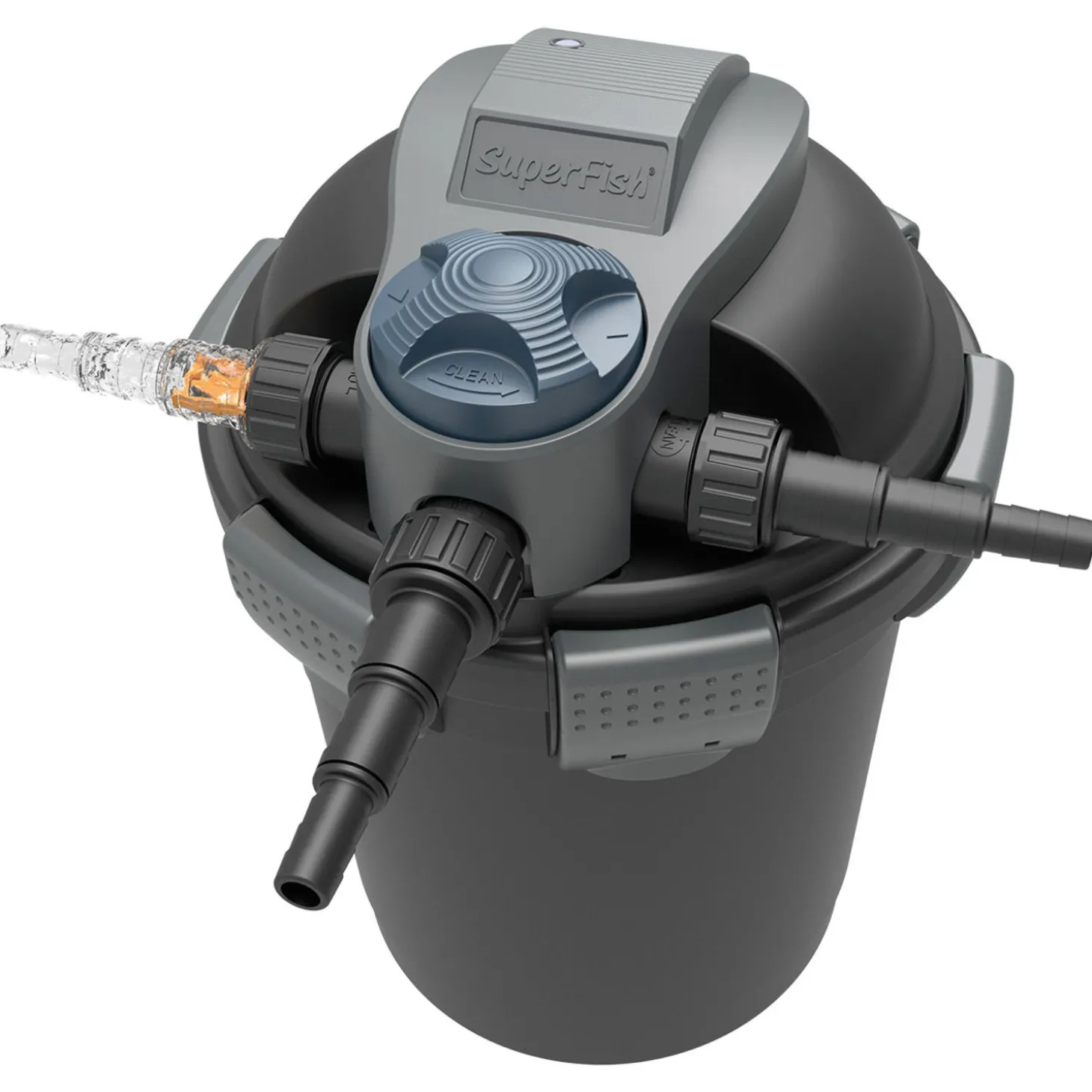 Een hoge drukfilter met ingebouwde UVC, dat is de TopClear UV 5000 van Superfish. Alle aansluitingen en de verdere technische onderdelen zijn vrijwel allemaal in het deksel geplaatst waardoor het filter zelf bijna helemaal ingegraven kan worden (plaatsing onder het waterniveau ook mogelijk).