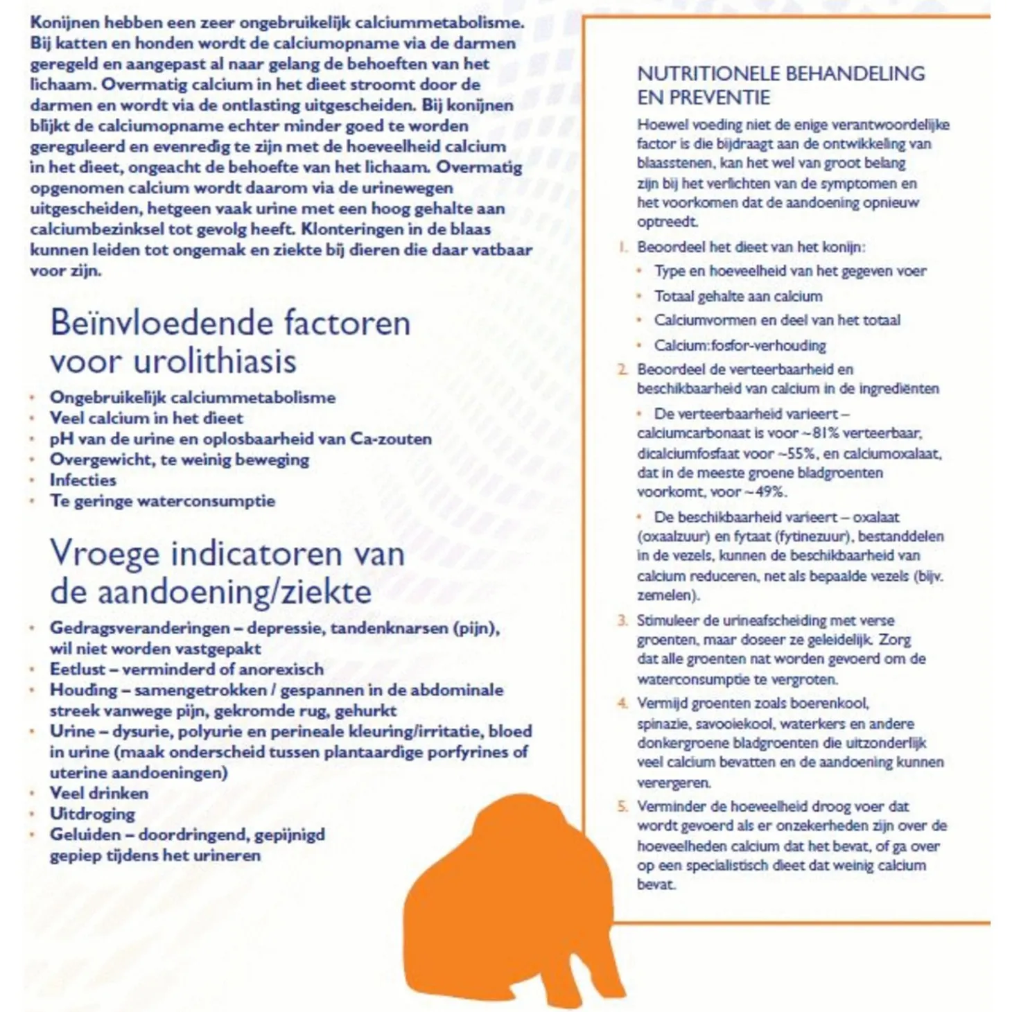 Bij honden en katten wordt de calciumopname geregeld vanuit de darmen en aangepast aan de behoeften van het lichaam. Hierbij wordt overtollig calcium uitgescheiden met de ontlasting. Bij konijnen lijkt de calciumabsorptie echter minder goed gereguleerd te zijn en lijkt deze inderdaad evenredig te zijn met de calciumspiegels in de voeding, ongeacht de vereisten. Hierbij wordt overtollig calcium als resultaat via de urinewegen uitgescheiden. Dit kan resulteren in urine met een hoog calciumgehalte. Slib in de blaas kan leiden tot ongemak.