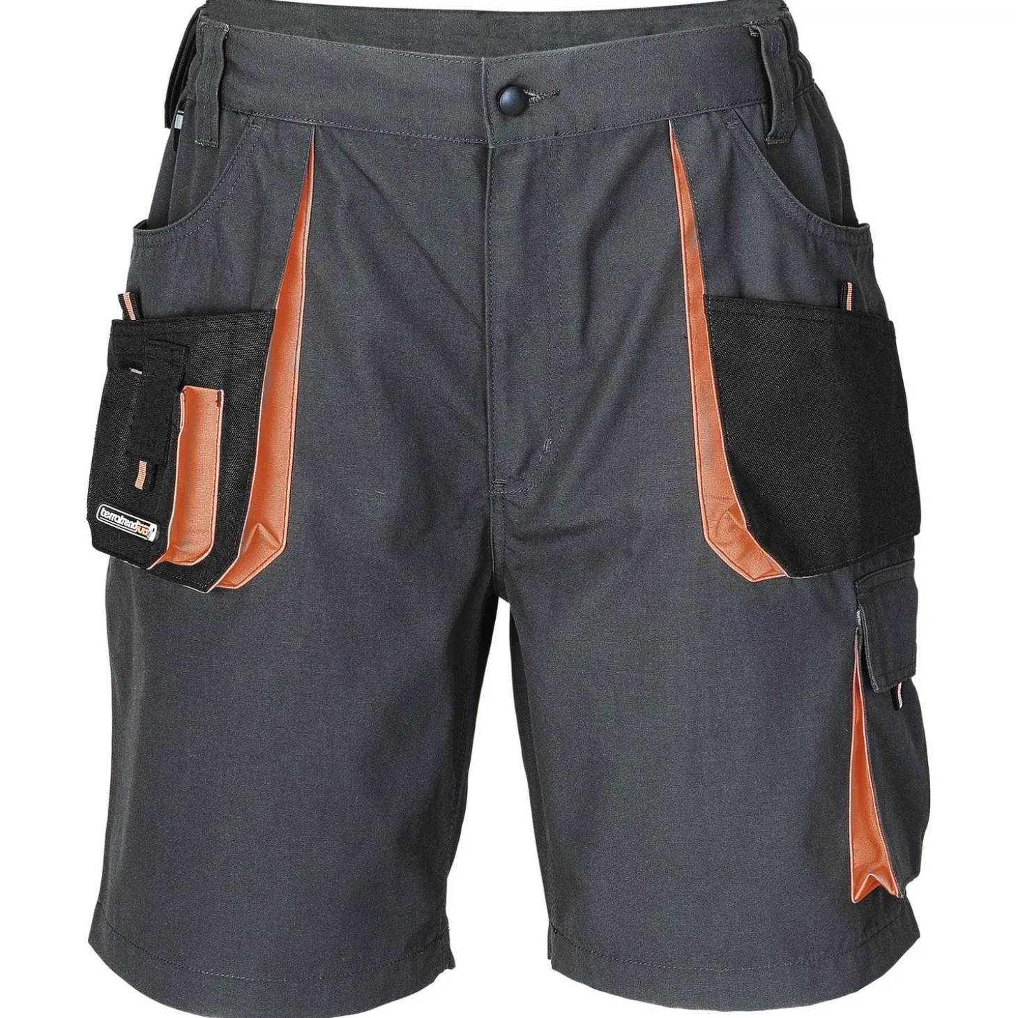Het Werkshort Grijs & Oranje & Zwart van Terratrend Job is een werkbroek met diverse opzetzakken in de kleur donkergrijs, met zwart ene oranje details. Verdere kenmerken van de broek zijn een mobiel- en duimstokzak, dat de belastingpunten in drievoud zijn genaaid en dat de broek een elastische tailleband heeft. De broek is gemaakt van 65% polyester en 35% katoen.