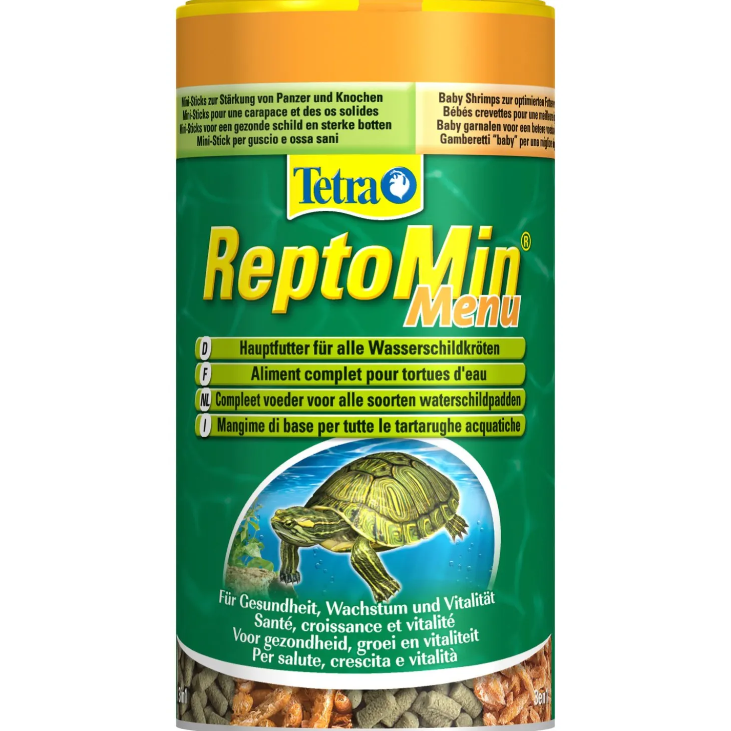 De ReptoMin Menu van Tetra is een gevarieerde afgestemde voeding voor alle waterschildpadden. Deze voeding bevat eiwitten en andere belangrijke voedingsstoffen die de groei van je waterschildpad bevorderen. De hele garnalen en ballaststoffen zorgen voor een optimale spijsvertering en een ideaal calcium- en fosforgehalte (mini-sticks) draagt bij aan het verstevigen van schild en botten. De Mini-kril in deze voeding stimuleert de algehele groei. De voeding is tot stand gekomen door het selecteren uit speciaal voor waterschildpadden ontwikkelde soorten om een uitgebalanceerde voeding te ontwikkelen.