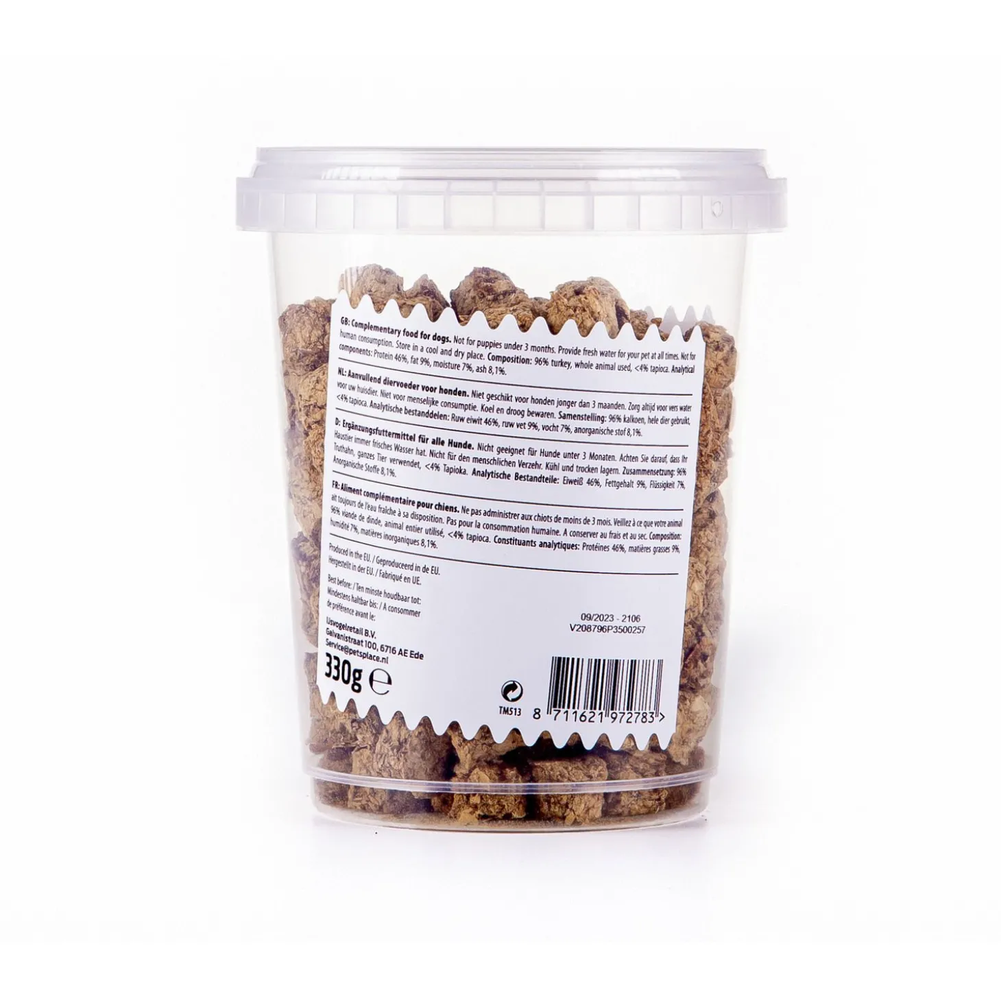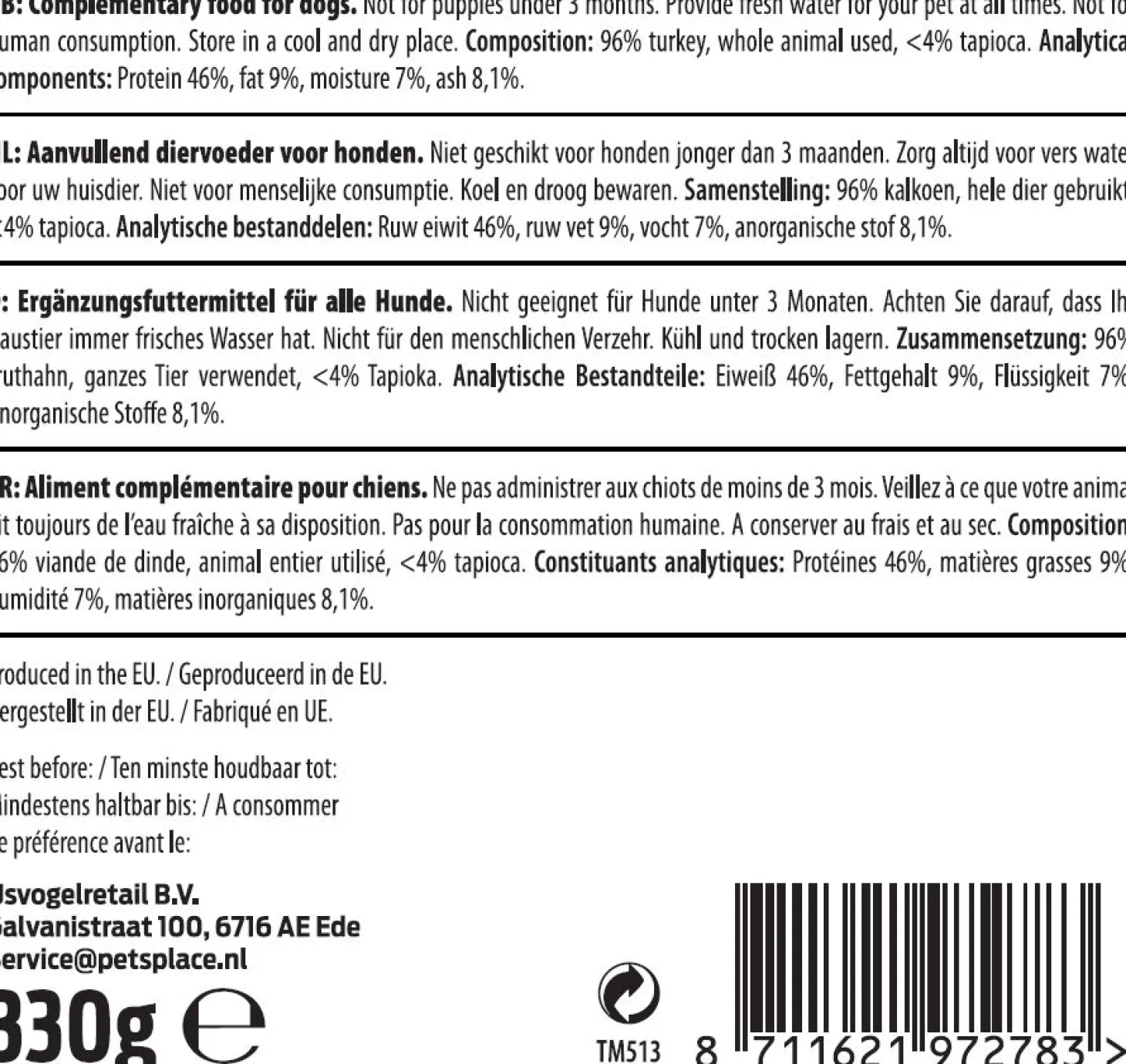 | Samenstelling | 96 % Kalkoen, hele dier gebruikt, <4% Tapioca |