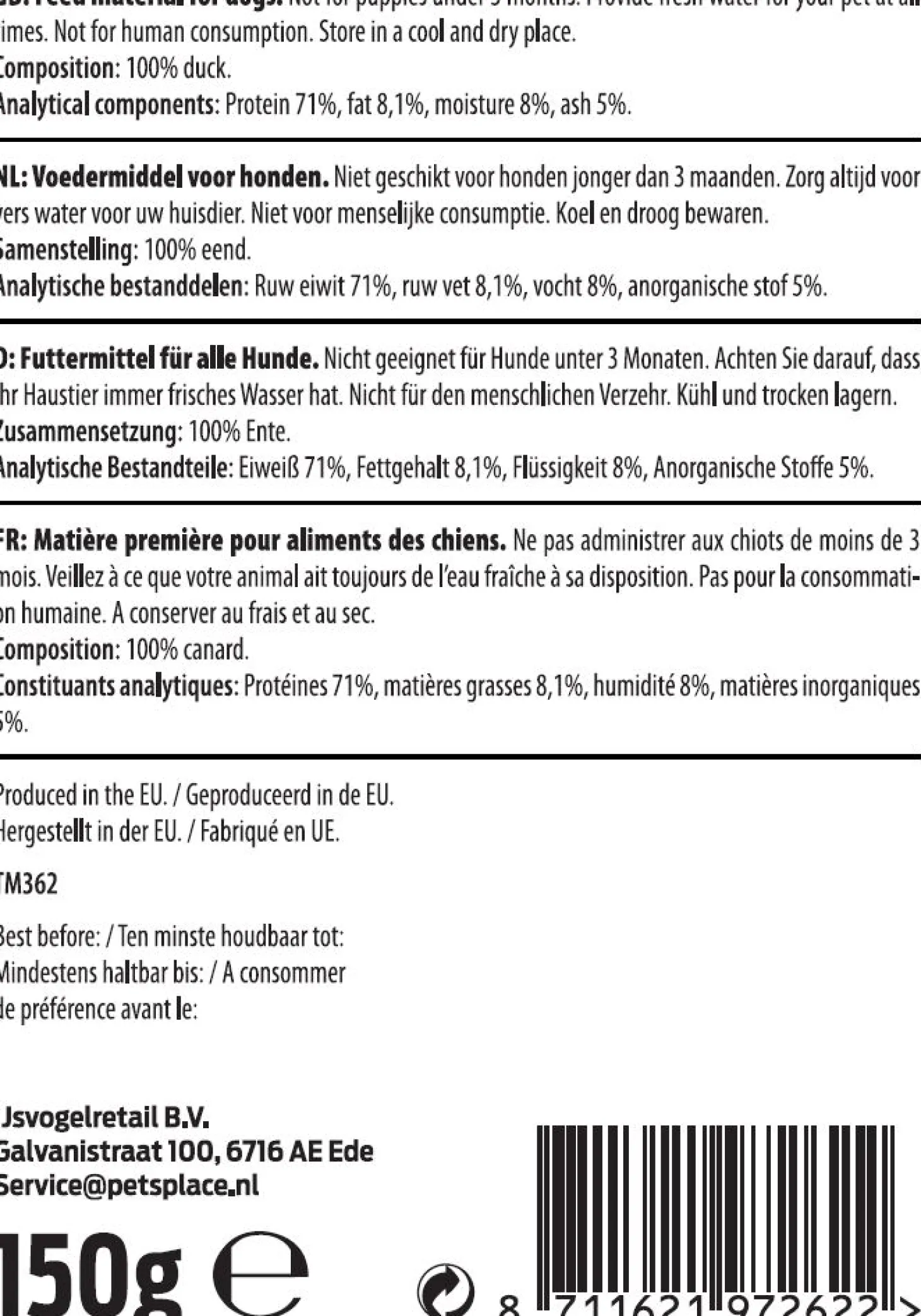 | Samenstelling | 100% eend |