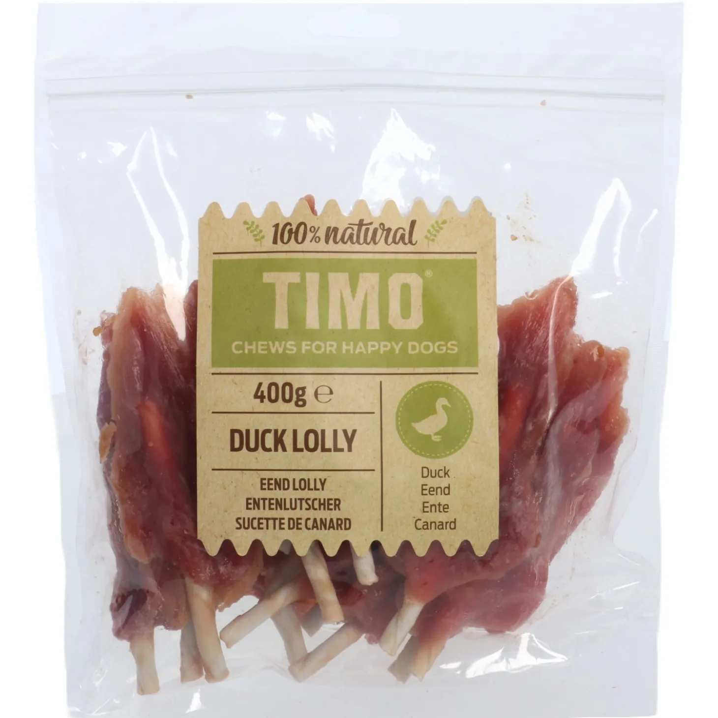 | Samenstelling | Eend 70%, ruwe huid 18%, zetmeel 3%, plantaardige eiwitten 2%, tarwemeel 1,5%,glycerine 3%,sorbitol 2% zout 0,4%, kaliumsorbaat 0,1% |