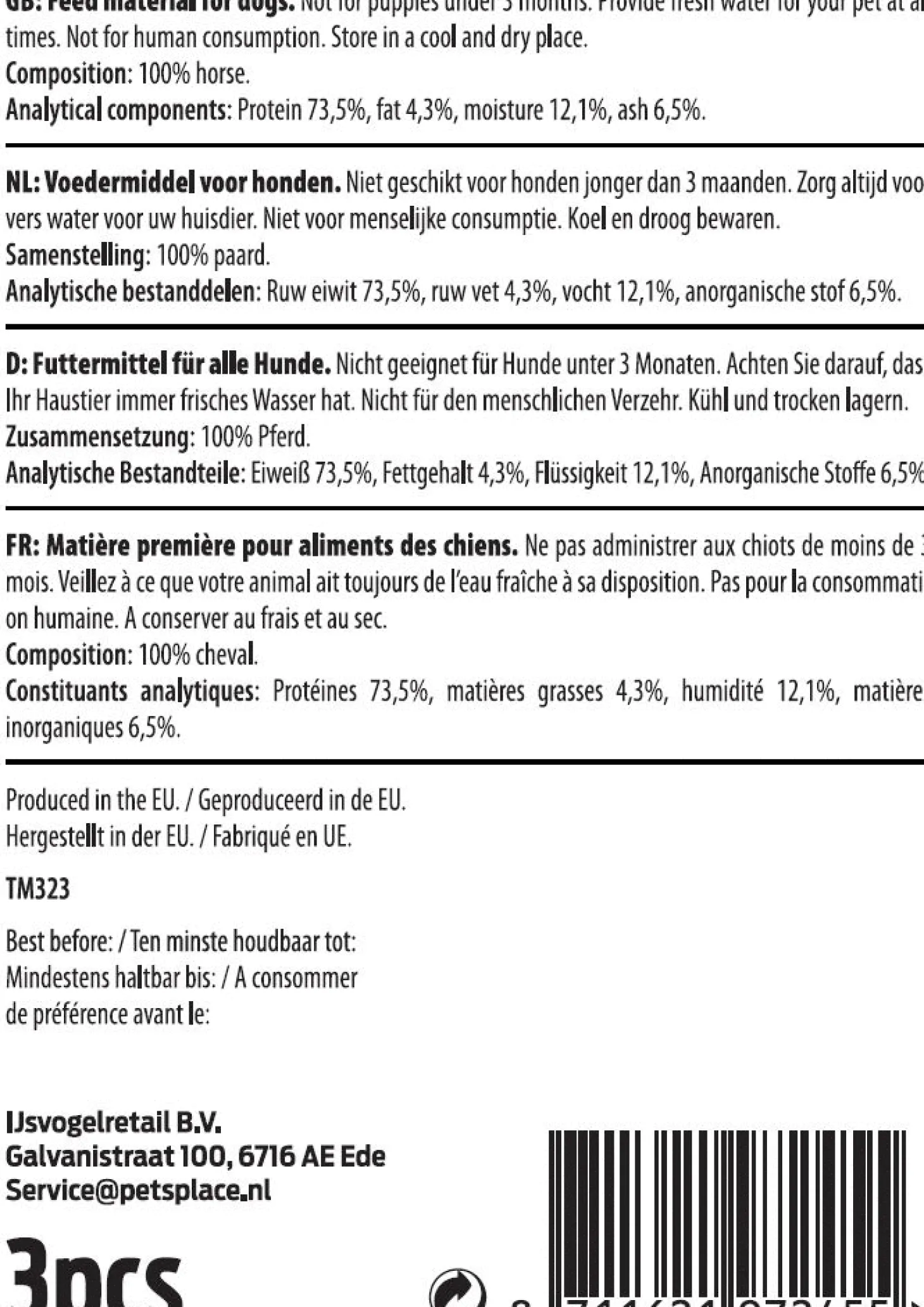 | Aanbeveling | De snack is niet geschikt voor honden jonger dan 3 maanden oud. Zorg altijd voor vers water voor je hond. Bewaar de snack koel en droog. Niet geschikt voor menseljike consumptie. |