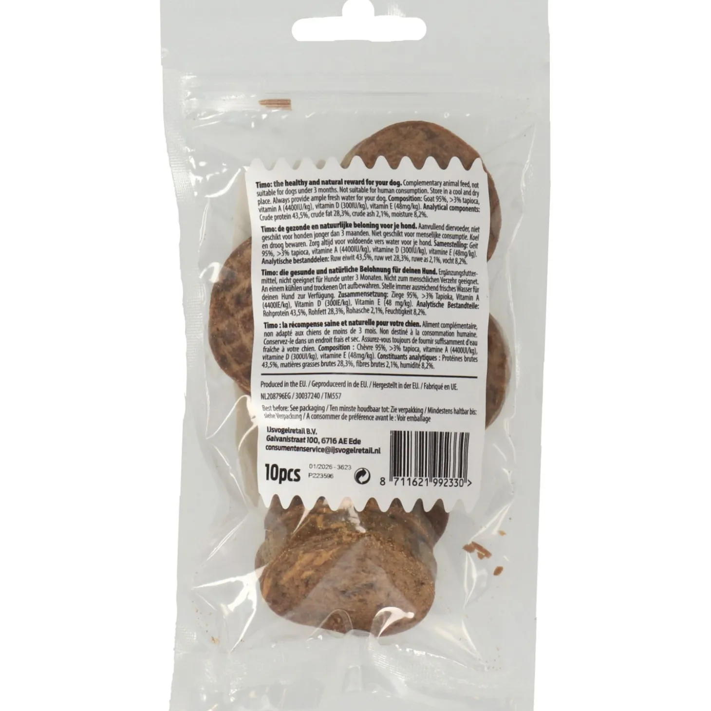 | Samenstelling | geit 95%, >3% tapioca, vitamine A (4400IU/kg), vitamine D (300IU/kg), Vitamine E (48mg/kg) |
