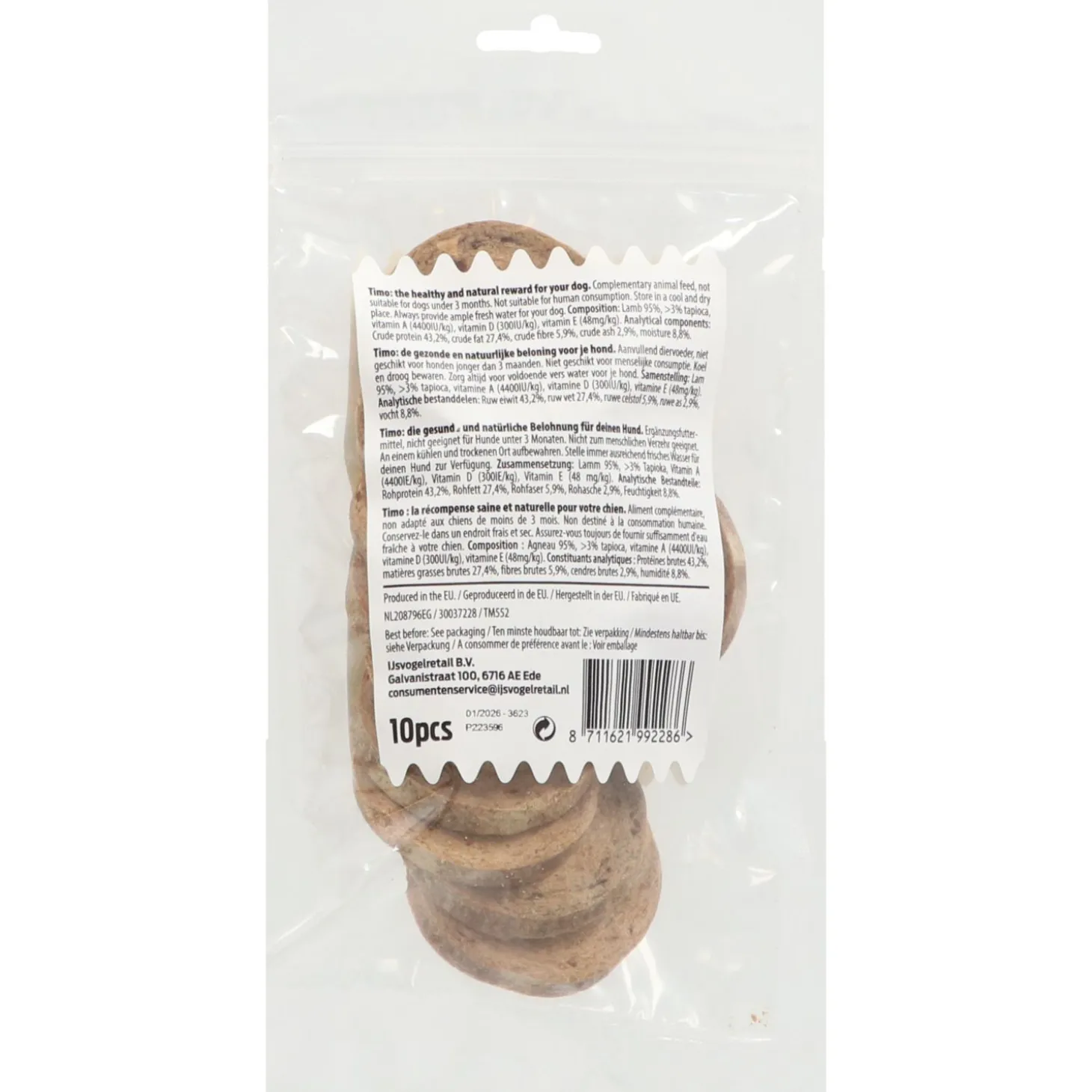 | Samenstelling | lam 95%, >3% tapioca, vitamine A (4400IU/kg), vitamine D (300IU/kg), Vitamine E (48mg/kg) |