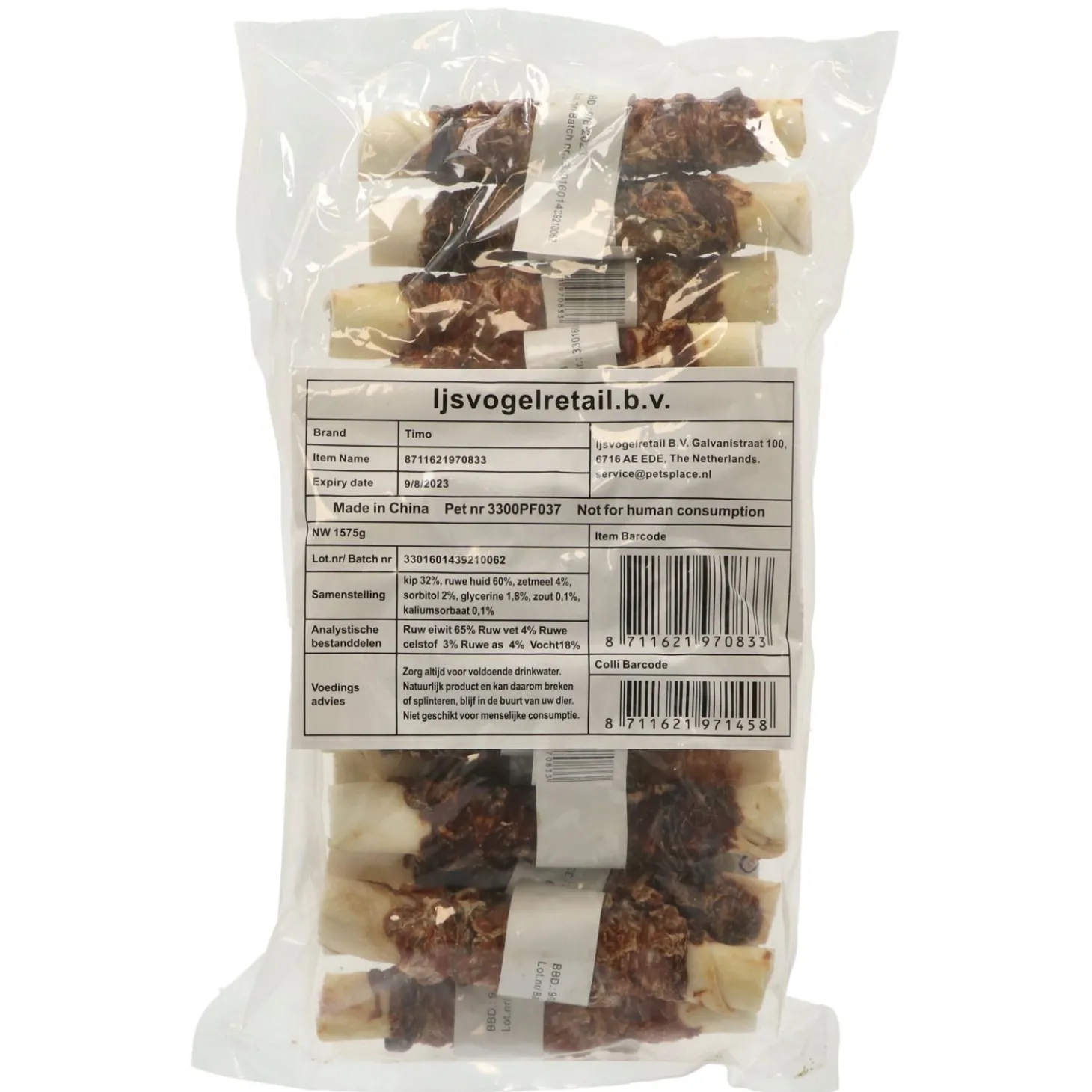 | Samenstelling | Kip 32%, ruwe huid 60%, zetmeel 4%, sorbitol 2%, glycerine 1,8%, zout 0,1%, kaliumsorbaat 0,1% |
