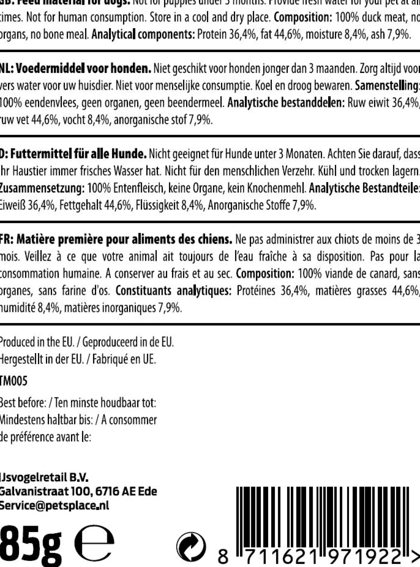 | Samenstelling | 100% eendenvlees, geen organen, geen beendermeel |
