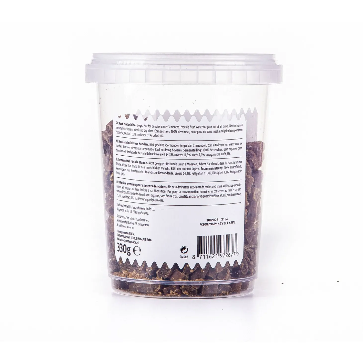 | Samenstelling | 100% hertenvlees, geen organen, geen beendermeel |
