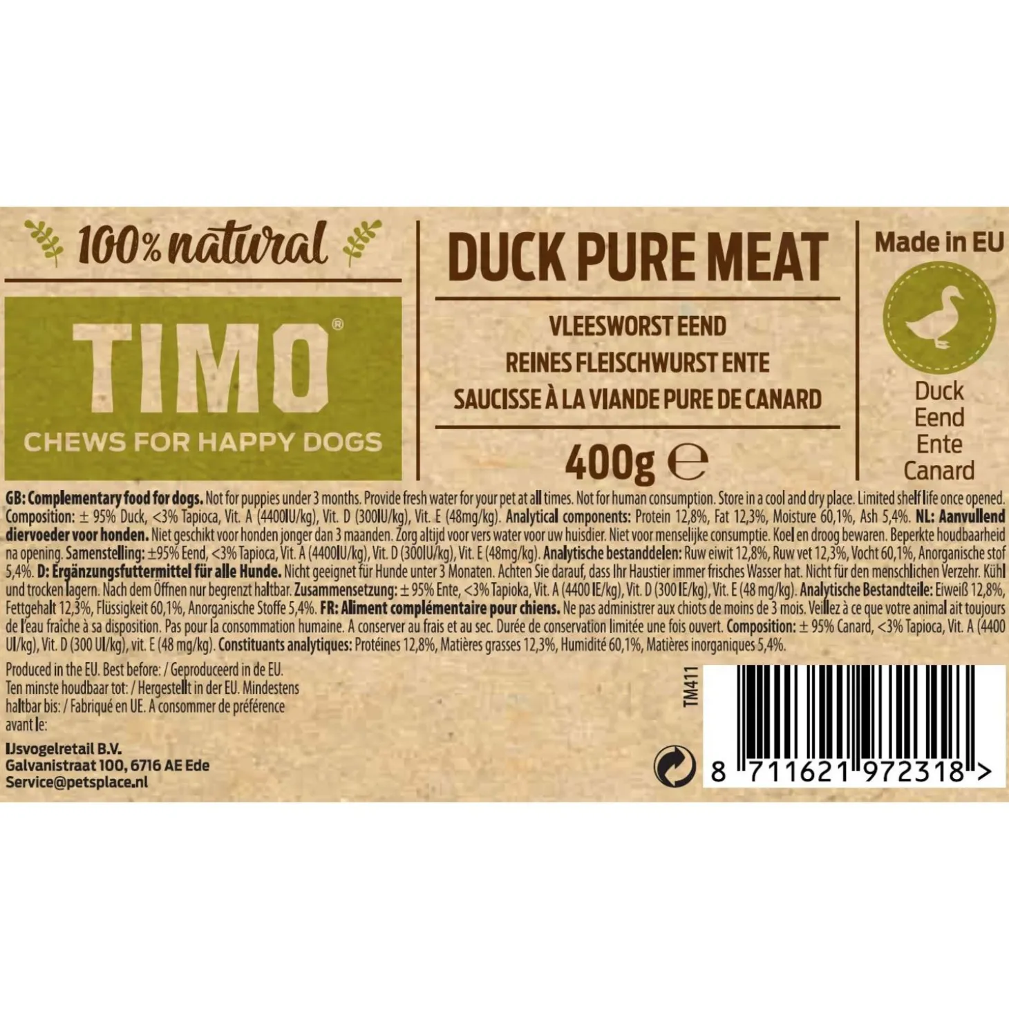Het betreft hier een aanvullend diervoeder! De worst is geschikt als tussendoortje of beloning, niet als volledige voeding. Wel is de worst bijvoorbeeld handig om mee te nemen op reis! De snack is goed verteerbaar en ondersteunt de spijsvertering. Je voorziet je hond met Timo van een gezonde en natuurlijke snack, die ook nog eens is geproduceerd in Europa.