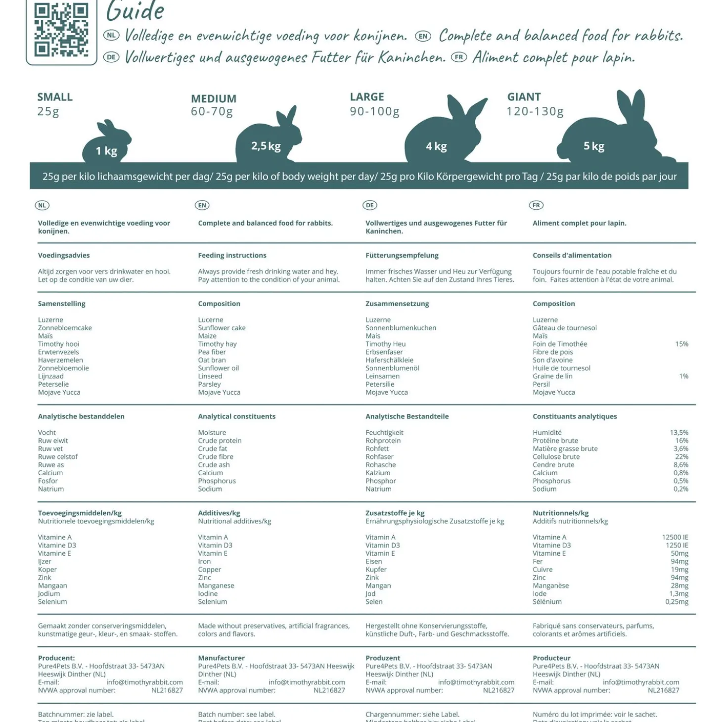 | Analyse | Luzerne, Zonnebloemcake, Maïs, Timothy hooi, Erwtenvezels, Haverzemelen, Zonnebloemolie, Lijnzaad, Peterselie, Mojave Yucca |
