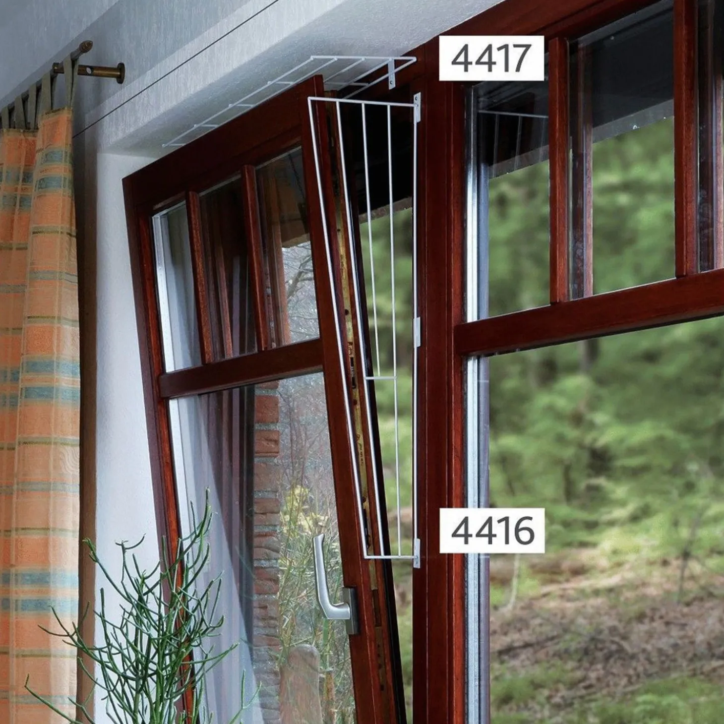 Beschermrooster voor een kiepraam ter voorkoming dat de kat naar buiten ontsnapt. Het rooster is van metaal en kan vastgeschroefd of gelijmd worden.