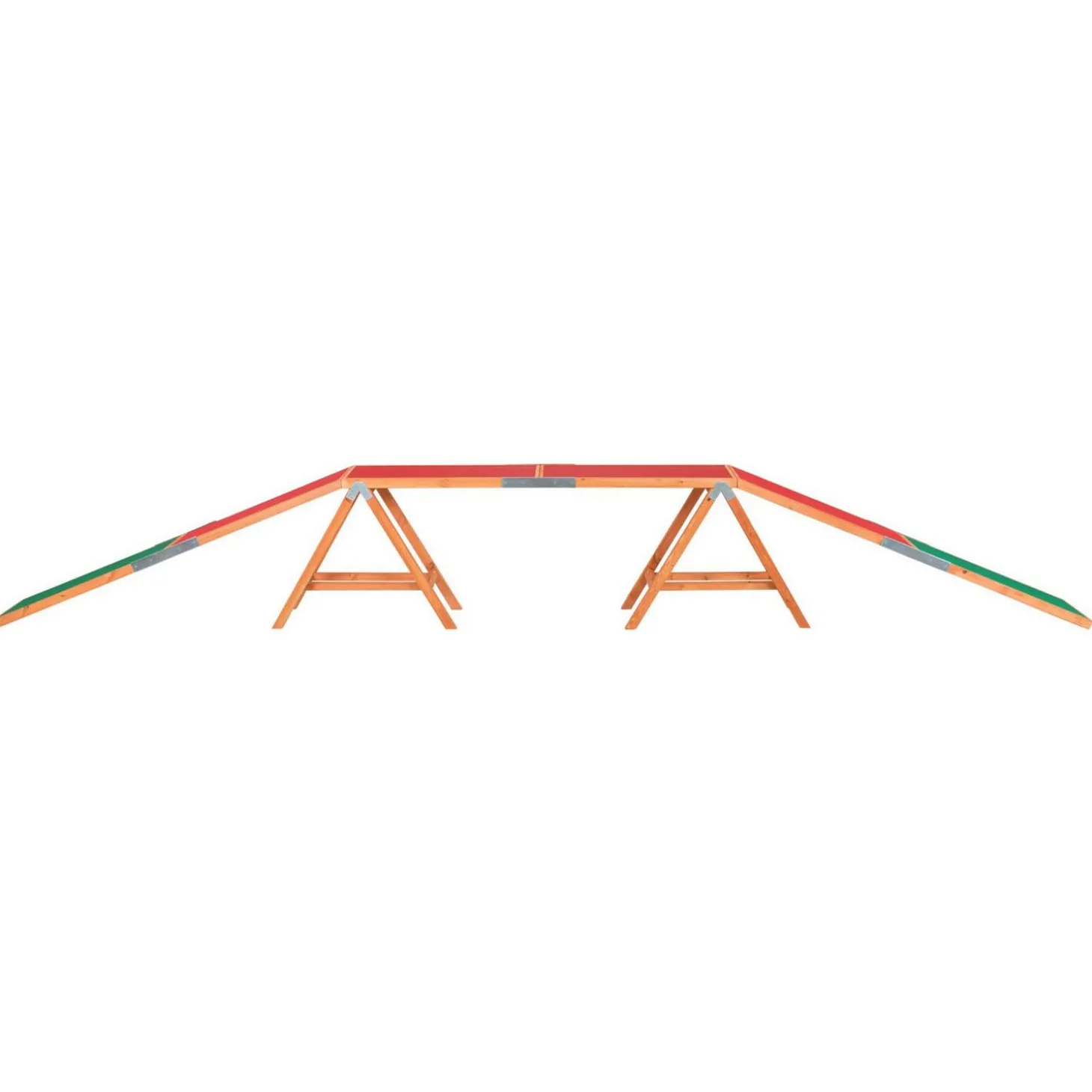 Deze loopbrug is gemaakt van gbeitst grenenhout. Het heeft kleurgemarkeerde raakvlakken met slipvaste bekleding. De brug kan tot 80kg dragen.