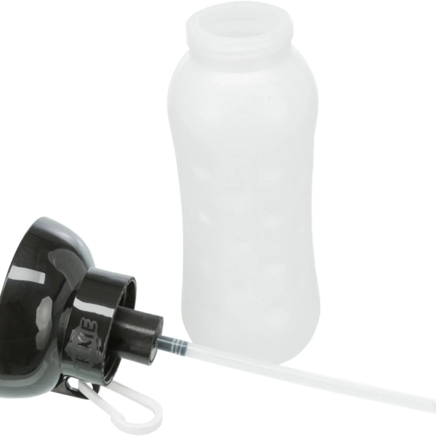- door drukken op de fles geraakt het water in het bak-opzetstuk