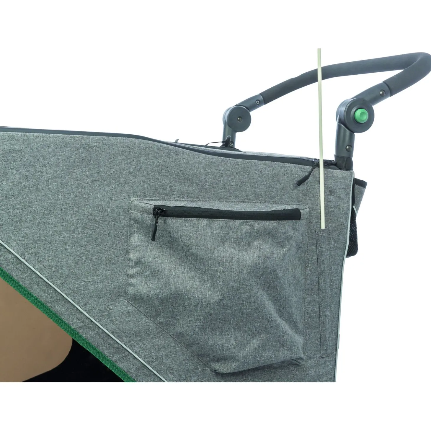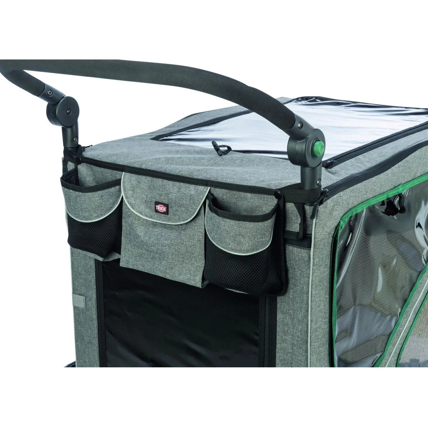 De gaas-inzetstukken van de fietskar zijn voorzien van regenbescherming die afgedekt kan worden wanneer het niet regent. Dit zorgt voor voldoende ventilatie en frisse lucht voor je hond tijdens de rit. De fietskar heeft ook diverse vakken en een bekerhouder, zodat je wat spullen kunt meenemen tijdens de rit. De vastzetrem zorgt ervoor dat de fietskar op zijn plaats blijft staan wanneer je stopt. Verder heeft de fietskar een geïntegreerde korthouder, zodat je hond veilig op zijn plaats blijft zitten tijdens de rit. De duwstang is in hoogte verstelbaar, waardoor je hem gemakkelijk kunt aanpassen aan je eigen lengte. De fietskar heeft ook lussen voor het bevestigen van een achterlicht en reflectoren, zodat je goed zichtbaar bent op de weg. De veiligheidsvlag met reflecterend werkje erin zorgt ervoor dat je nog beter opvalt.