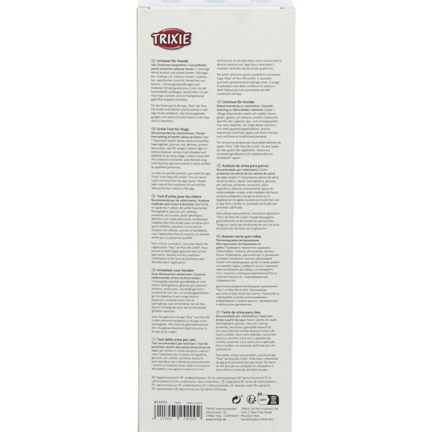 Door regelmatig deze urinetest te gebruiken, kun je problemen met de gezondheid van je hond in een vroeg stadium opsporen en er iets aan doen. De Trixie Urinetest Kit maakt het simpel om de nieren, urinewegen en bloedsuikerspiegel van je hond te controleren. Zo geef je je hond de beste zorg mogelijk. Doe wat extra voor het welzijn van je hond en maak gezondheidstesten een routine met de Trixie Urinetest Kit.