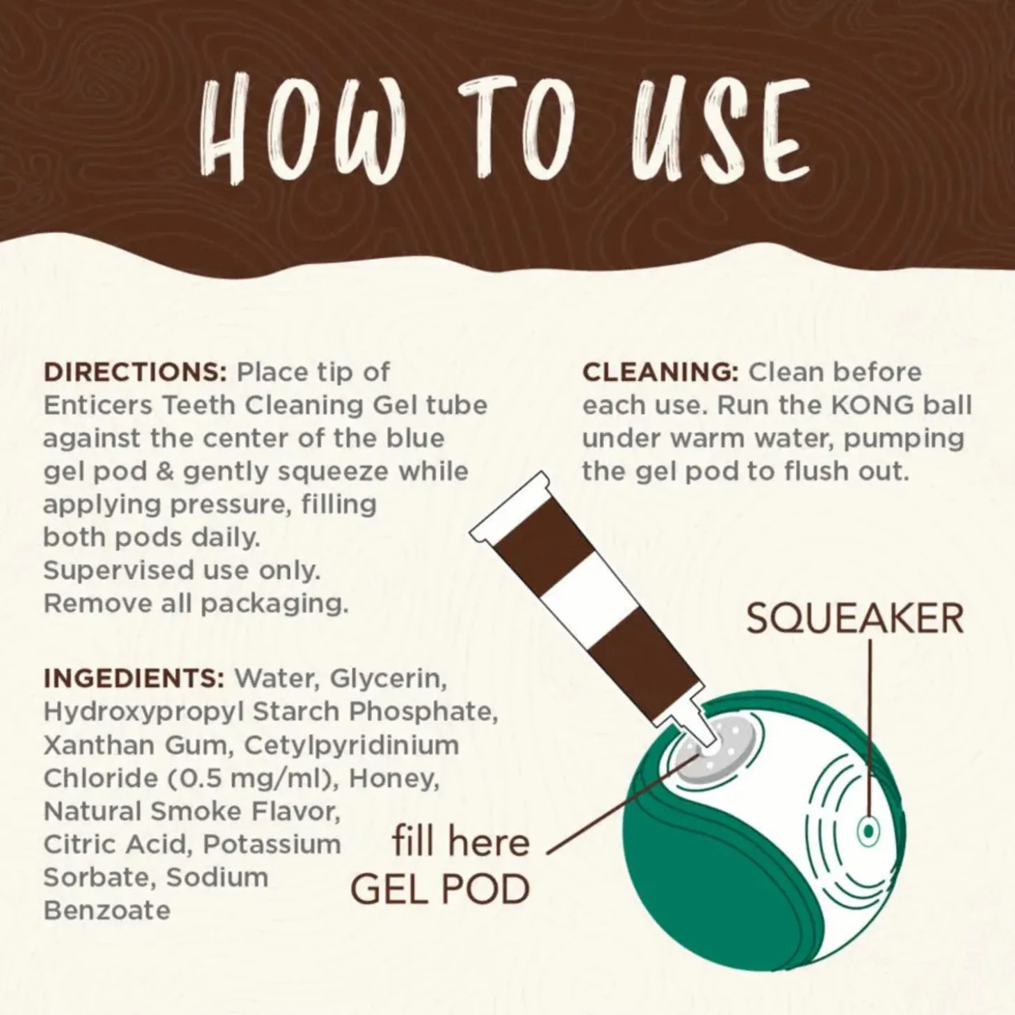 De set bevat een tube met gerookte rundvleessmaak dat dient als een heerlijke traktatie die tevens de tanden zal reinigen tijdens het kauwen. Je stopt de gel in de bijbehorende KONG-bal. Deze heeft een speciale textuur dat helpt bij het wegschrapen van het tandplak, terwijl de gel tegelijkertijd de bacteriën uit de mond verwijderd die zorgen voor een slechte adem.