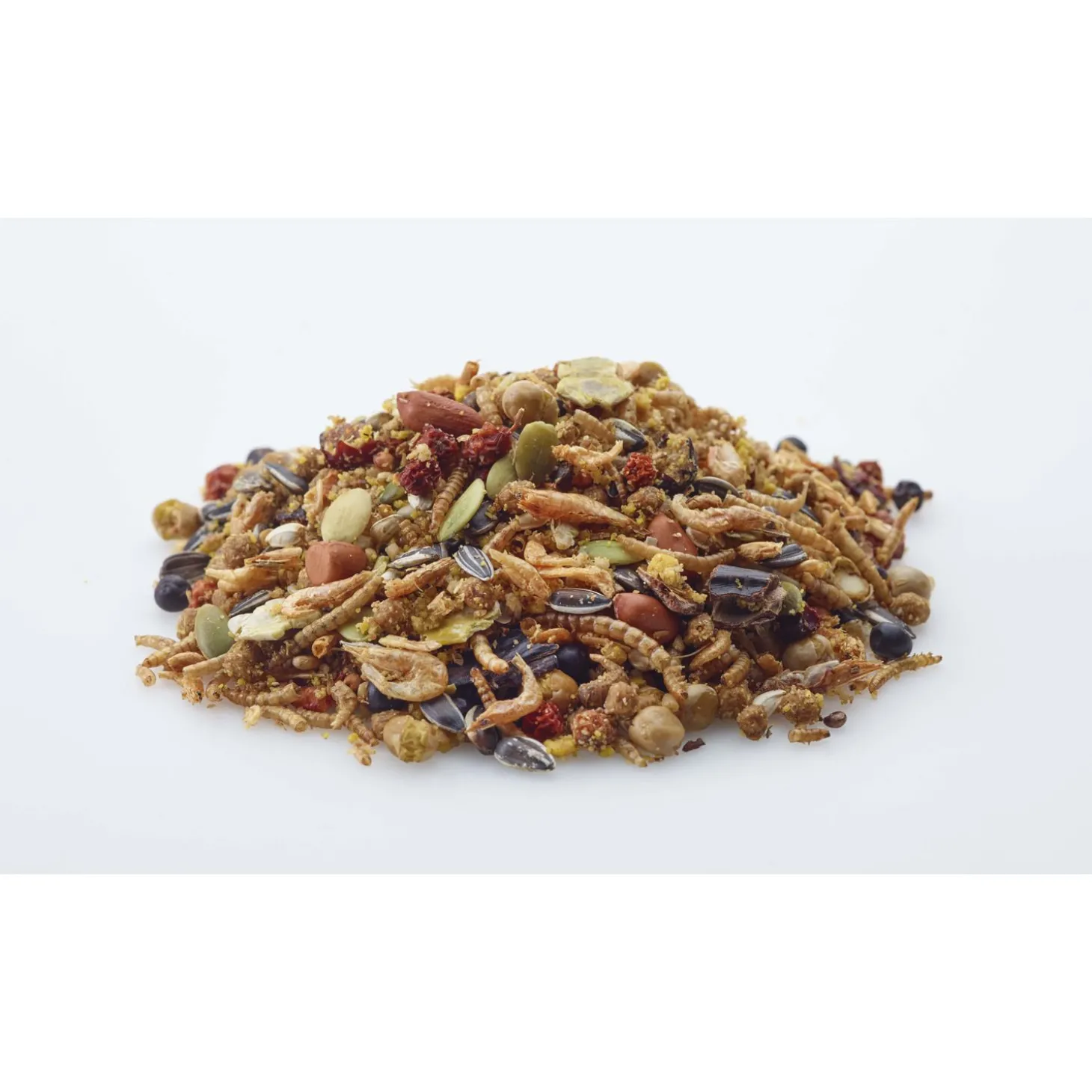 | Samenstelling | zaden | vruchten | groenten | insecten (meelwormen 5%) | granen | bakkerijproducten | oliën en vetten | schaal- en weekdieren (garnalen 5%) | plantaardige eiwitextracten | noten | vlees en dierlijke bijproducten | ei en eiproducten (1,5%) | honing | mineralen | suiker | plantaardige bijproducten | gist | vis en –bijproducten | FOS | MOS | yucca |