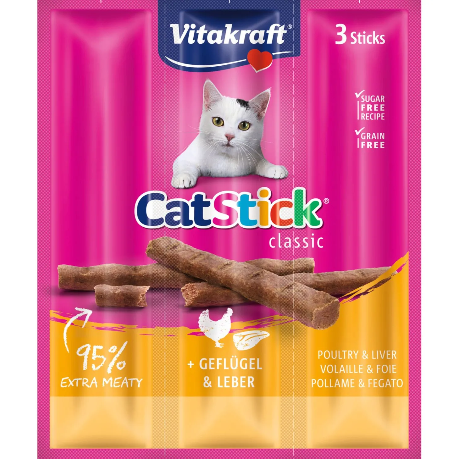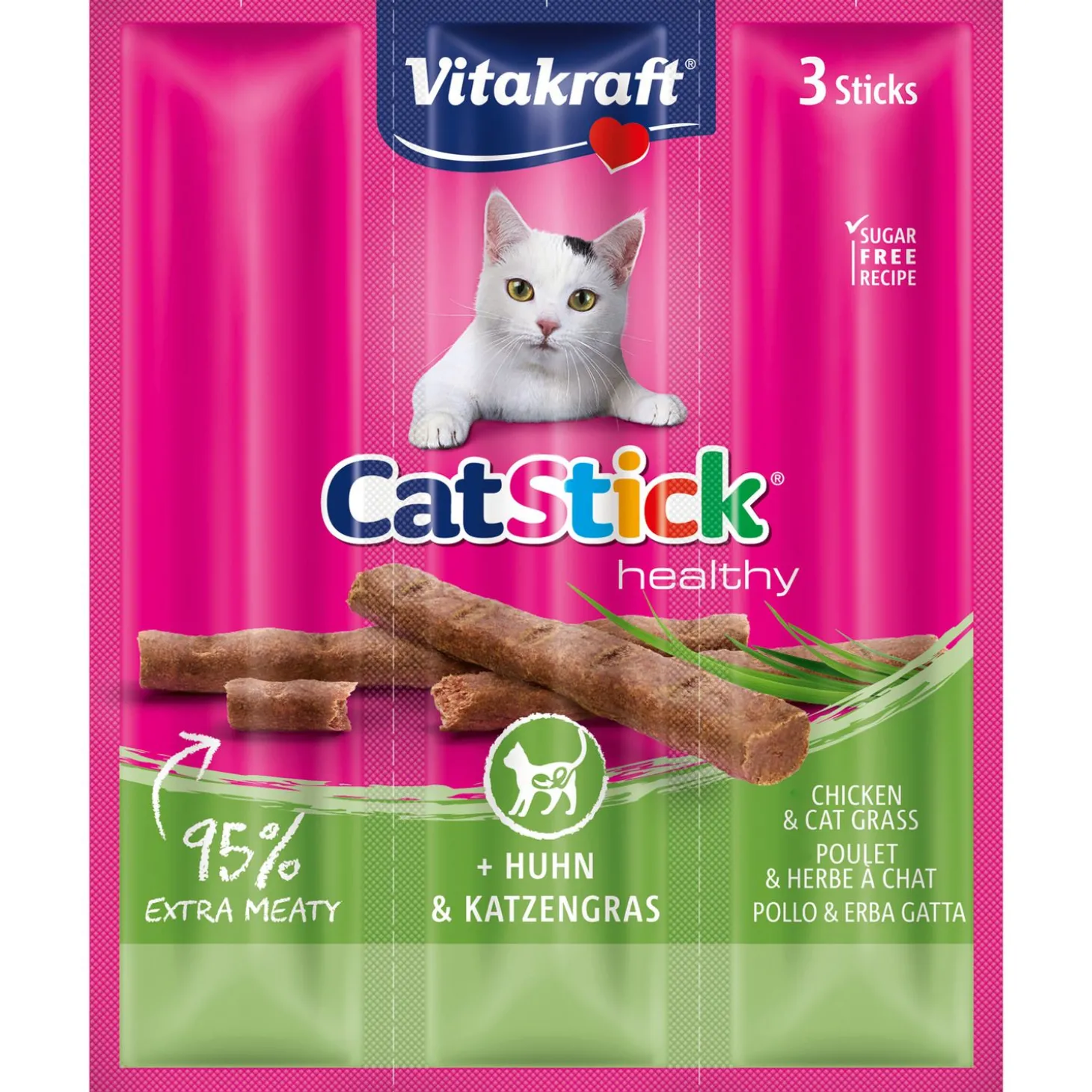 Je kent ze vast wel, de populaire Cat Stick van Vitakraft. Drie smakelijke en vlezige stickjes verkrijgbaar in wel 7 verschillende smaken waar jouw kat geen nee tegen zegt. Een smakelijke snack met een extra hoog vleesgehalte (tot wel 95%!) en een unieke onweerstaanbare smaak, en dat volledig zonder smaakversterkers.