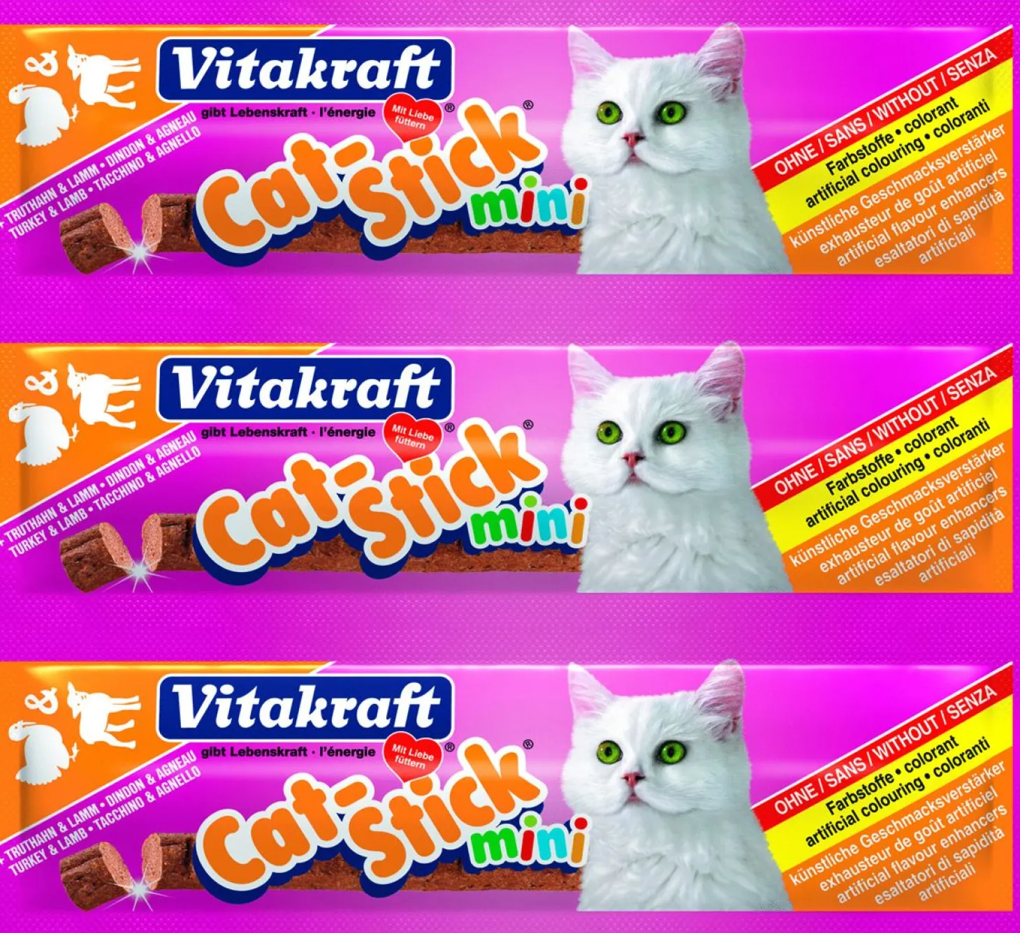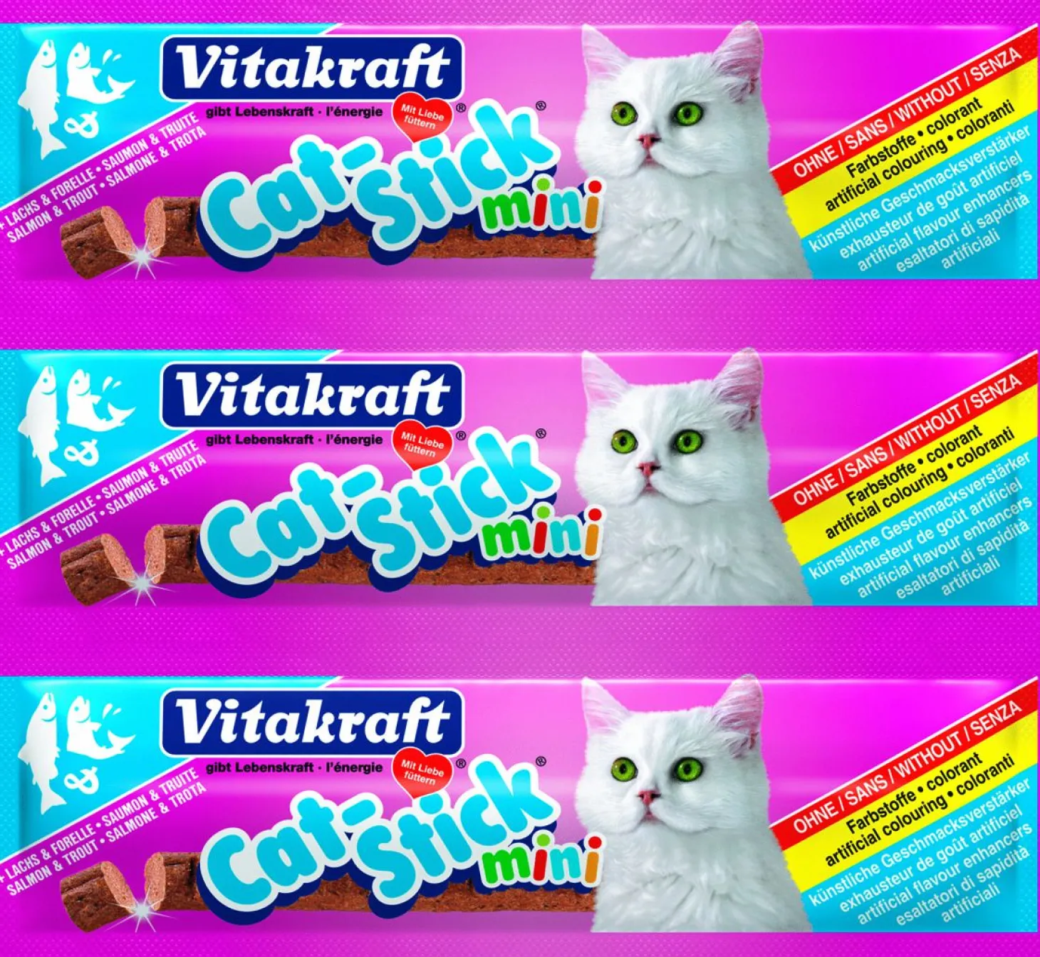 Cat-Stick Mini van Vitakraft is verpakt per 3 stuks in de smaken eend-konijn, gevogelte-lever, kabeljauw-tonijn, kalkoen-lam, kip, schol-omega 3 en zalm