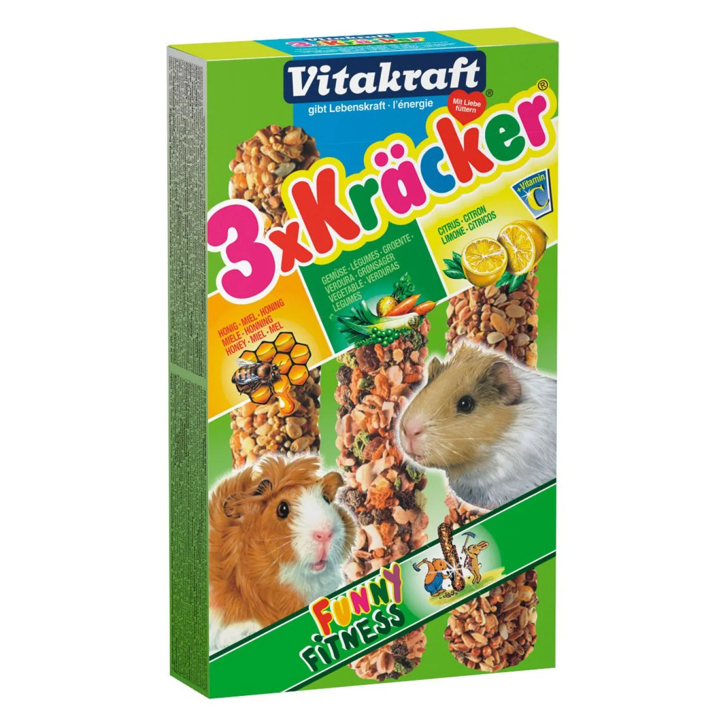 De Vitakraft Krackers zijn tot wel drie keer in de oven gebakken waardoor de samengeperste ingrediënten extra stevig aan het knabbelhoutje zitten. Je dier moet flink zijn tanden in de kracker zetten om er wat lekkers af te krijgen. De krackers zijn dus niet alleen gezond maar dragen ook bij aan een goede tandslijtage. Het is een feest wanneer je dier mag smullen van deze heerlijke krackers.