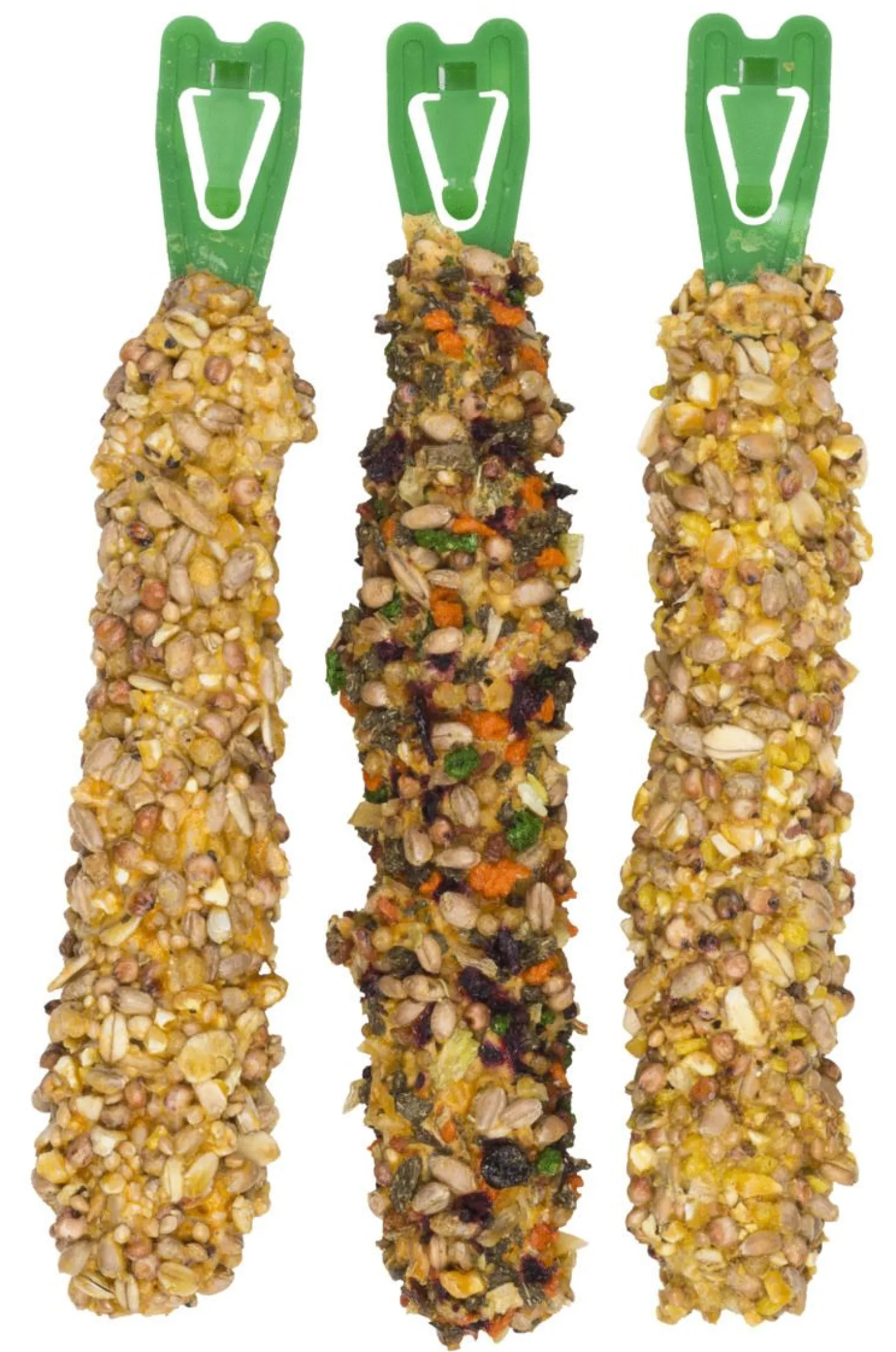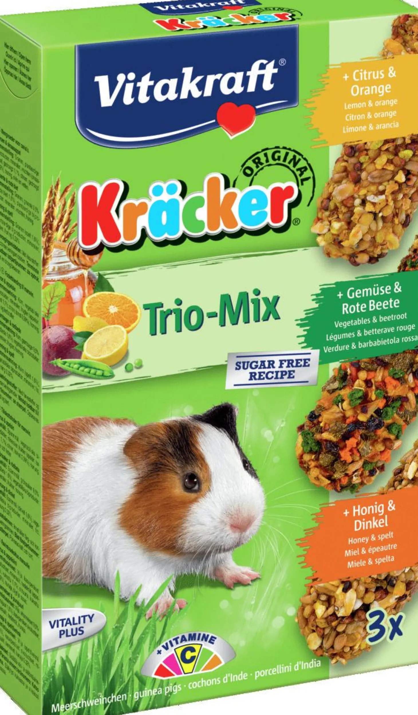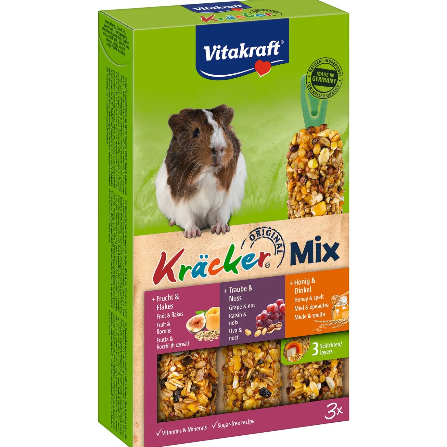 Cavia 3in1 Kracker is verpakt per 3 stuks in de smaken honing, fruit en noten, honing, groente en citrus, honing, popcorn en noten