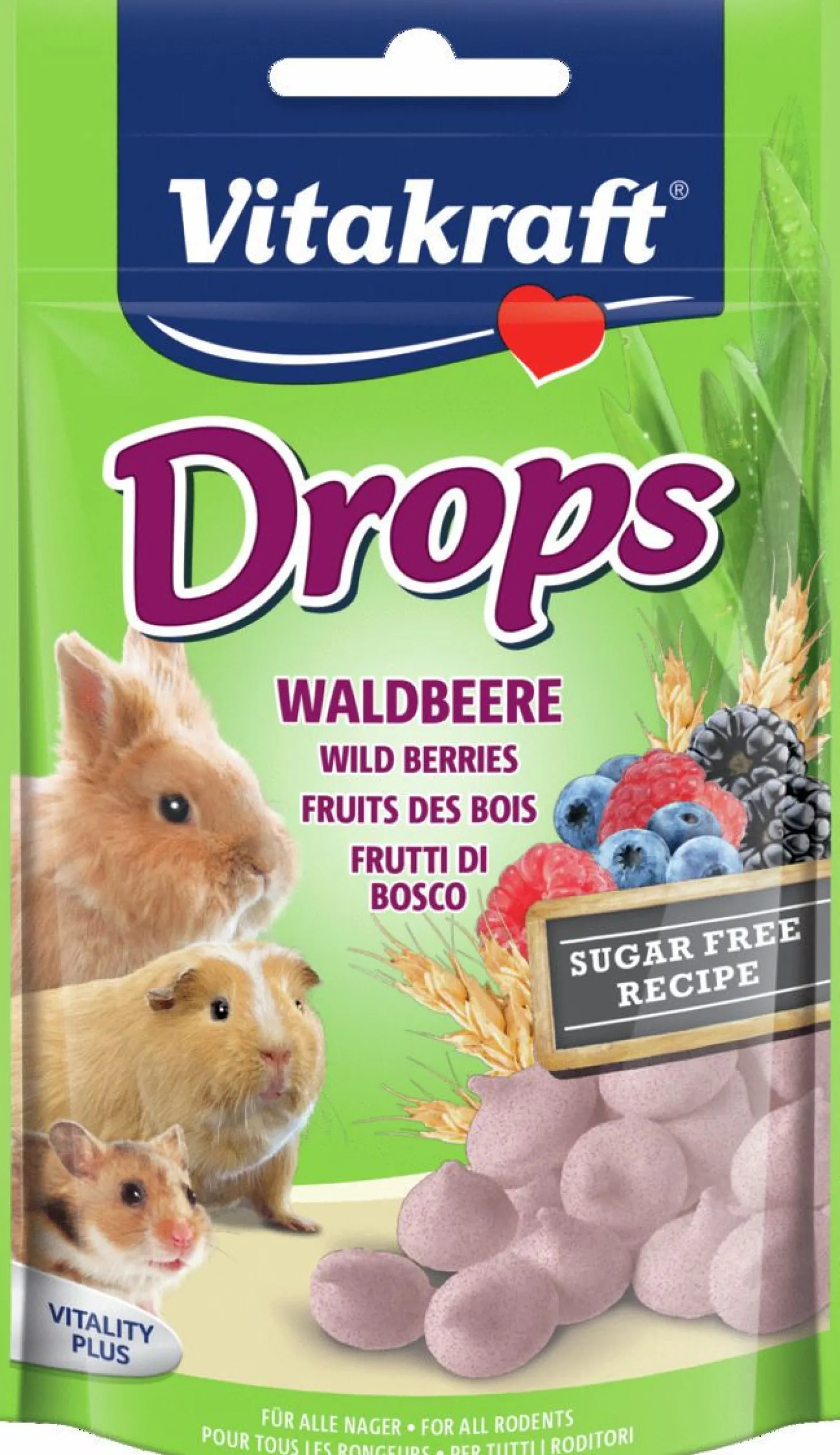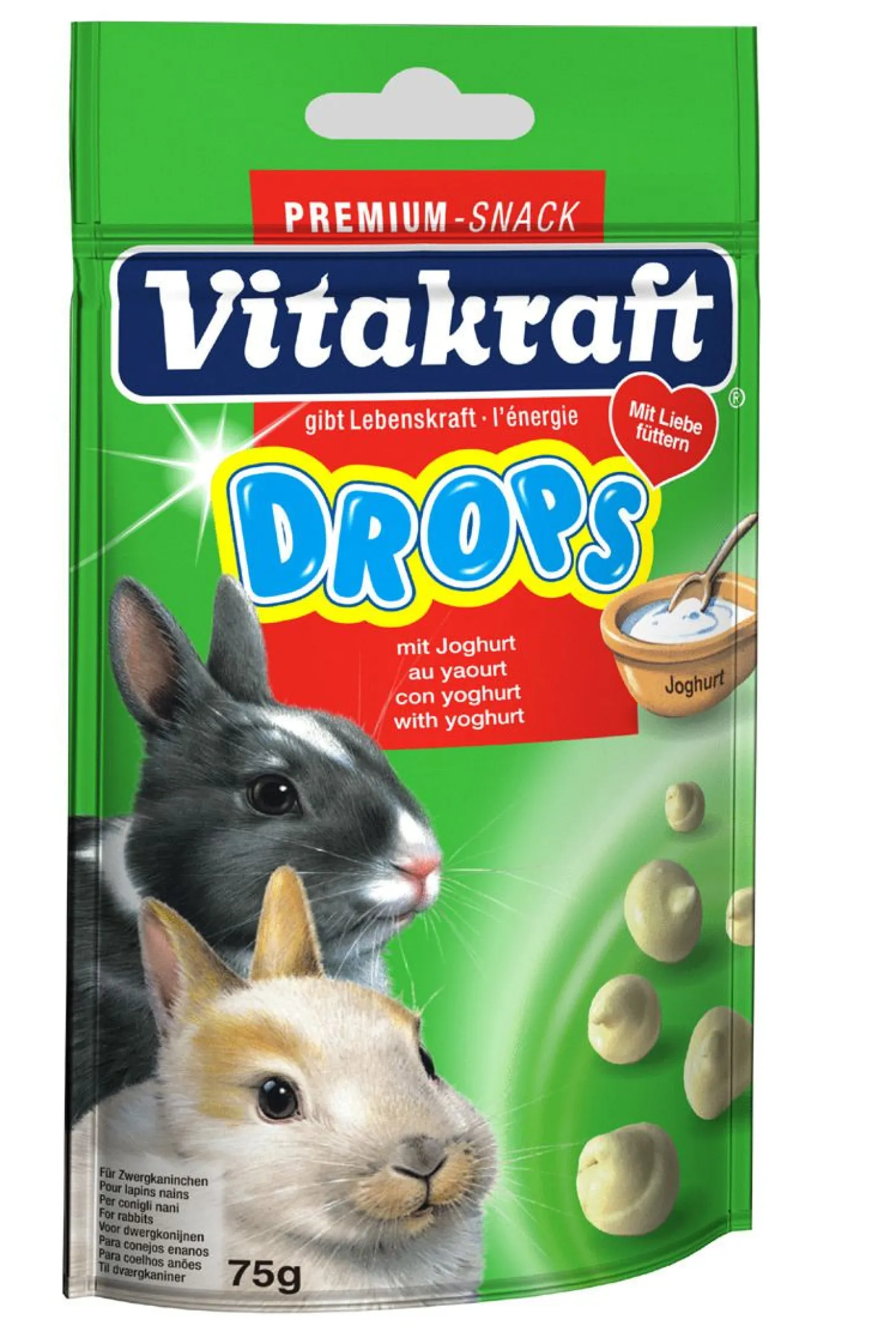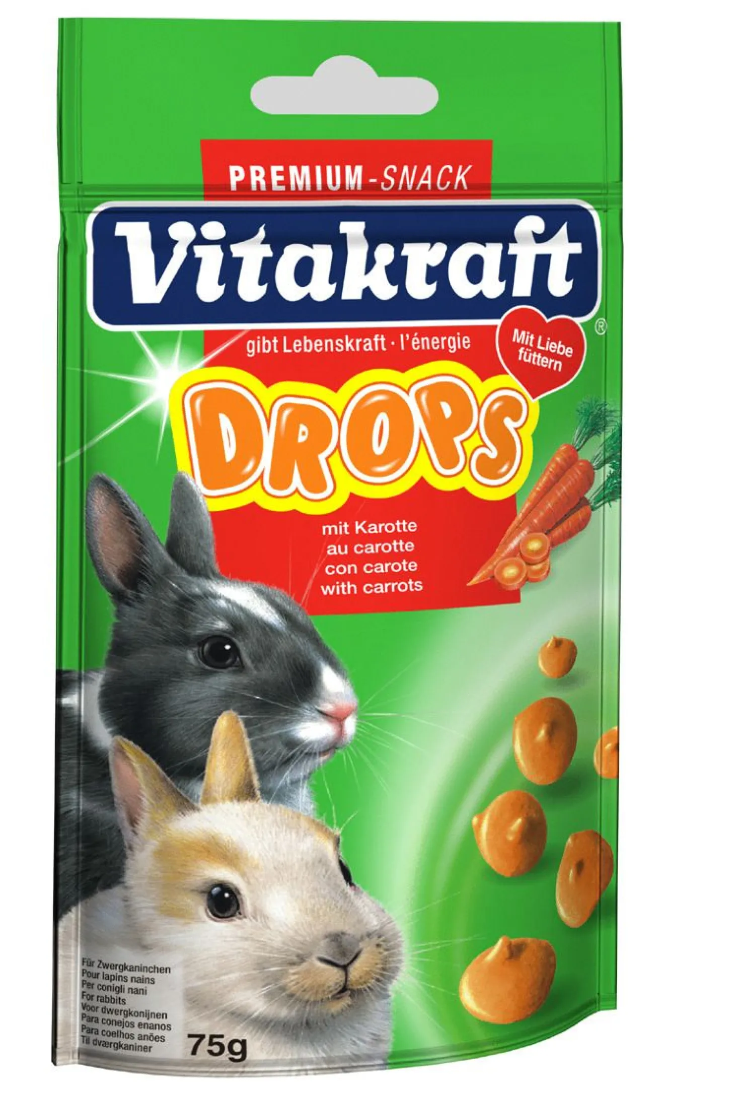 Konijn Drops van Vitakraft is verkrijgbaar in 75g in de smaak bosvruchten, wortel en yoghurt