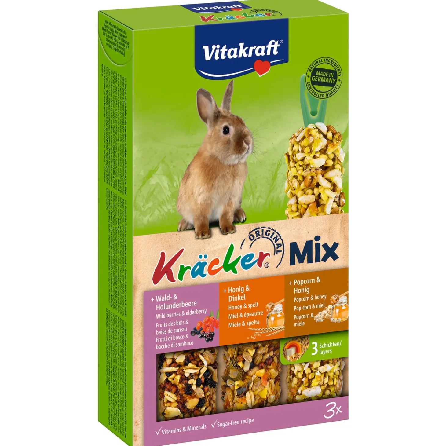 Konijn 3in1 Kracker is verpakt per 3 stuks in de smaken Bos- en vlierbessen, honing en spelt en popcorn en honing, Popcorn en honing, groente en rode biet en druiven en noot, Groente en rode biet, druiven en noot, bos- en vlierbessen