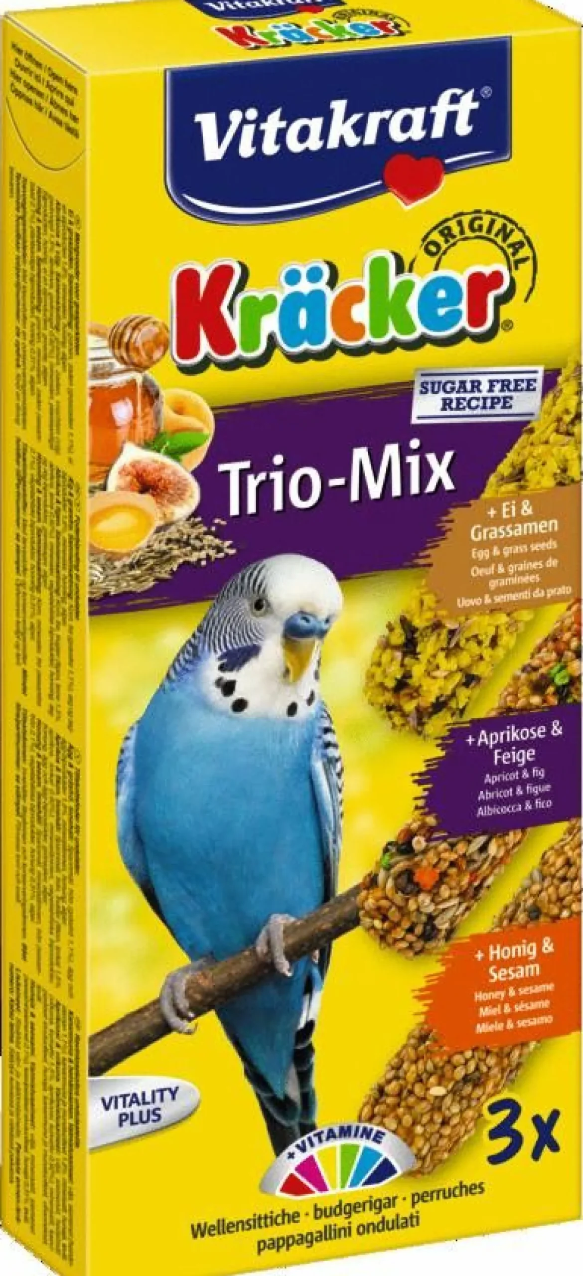 Parkiet Kracker combi is verpakt per 3 stuks in de smaak honing, honing, ei en fruit, honing, sinaasappel en popcorn, kiwi, vijg en banaan