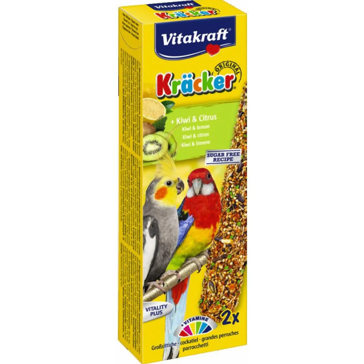 Valkparkiet Kracker is verpakt per 2 stuks in de smaak honing en eucalyptus, amandel en vijg, kiwi en citrus