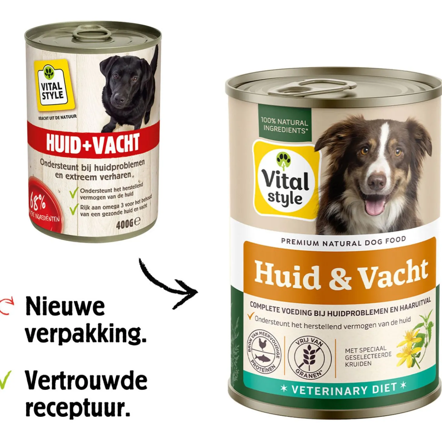 HUID + VACHT van VITALstyle is een heerlijke natvoeding voor je hond met een hoog gehalte aan essentiële vetzuren om de huid te ondersteunen.