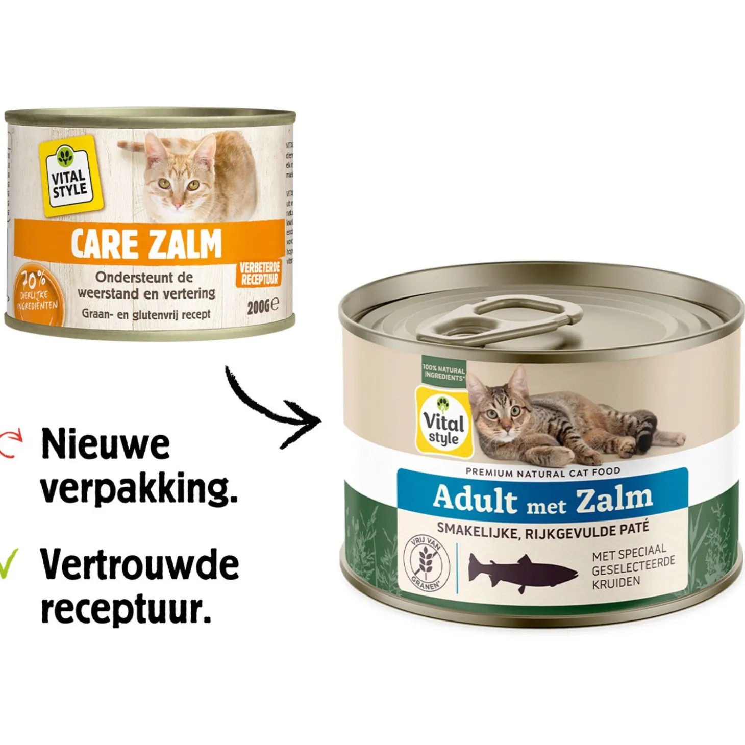 CARE met Zalm van VITALstyle is een heerlijke natvoeding voor katten van alle rassen. De voeding bevat diverse ingrediënten met een hoog vleesgehalte. Het gebruikte vlees is van hoge kwaliteit en heeft een mooie structuur. Dit natvoer met minimaal 70% vlees zal zorgen voor een gezonde en evenwichtige kat!