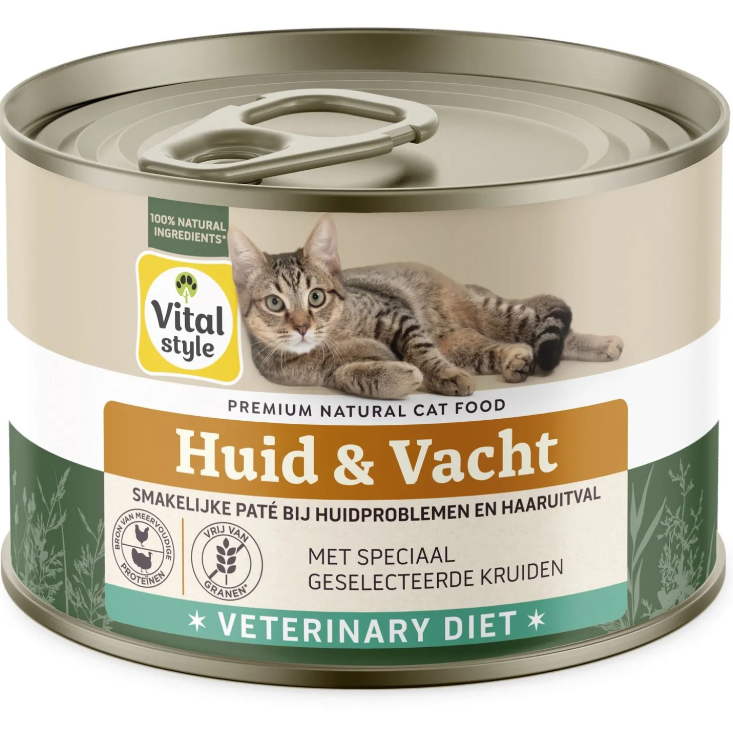 HUID + VACHT van VITALstyle is een heerlijke natvoeding voor je kat. Deze dieetvoeding zal een gezonde huid en vacht ondersteunen. De ingrediënten zijn goed verteerbaar en de spijsvertering wordt op een positieve manier beïnvloed. Dankzij deze voeding wordt de huid niet belast, maar juist ondersteunt. Zo blijft jouw kat in topconditie!