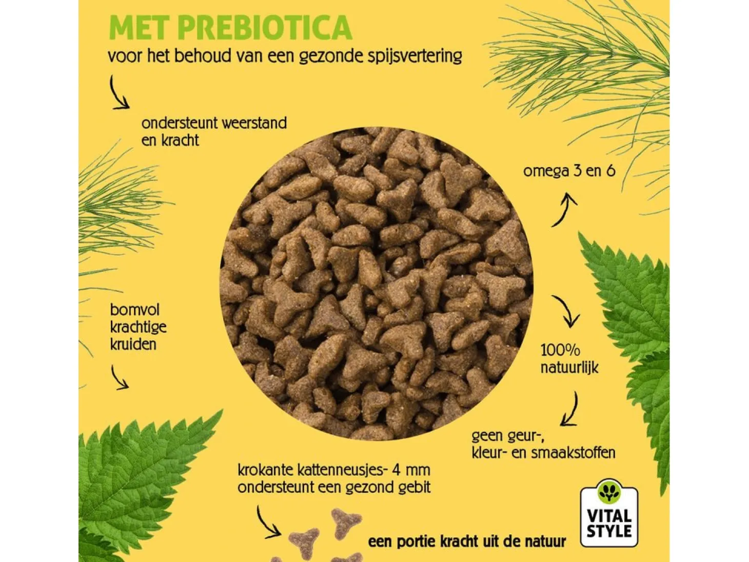 | Samenstelling | Gevogelte, dierlijk eiwitextract, tarwe, vis, maïs, gehydrolyseerde KIPpenlever, dierlijk vet (gevogelte), gerst, rijst, maïsgluten, kruidenmix waaronder brandnetel (0,3%), cichoreiwortel (0,01%), heermoes (0,16%), valeriaan (0,05%), zonnebloemolie, bietenpulp, lijnzaad, gist, visolie (ZALM), cellulose. |