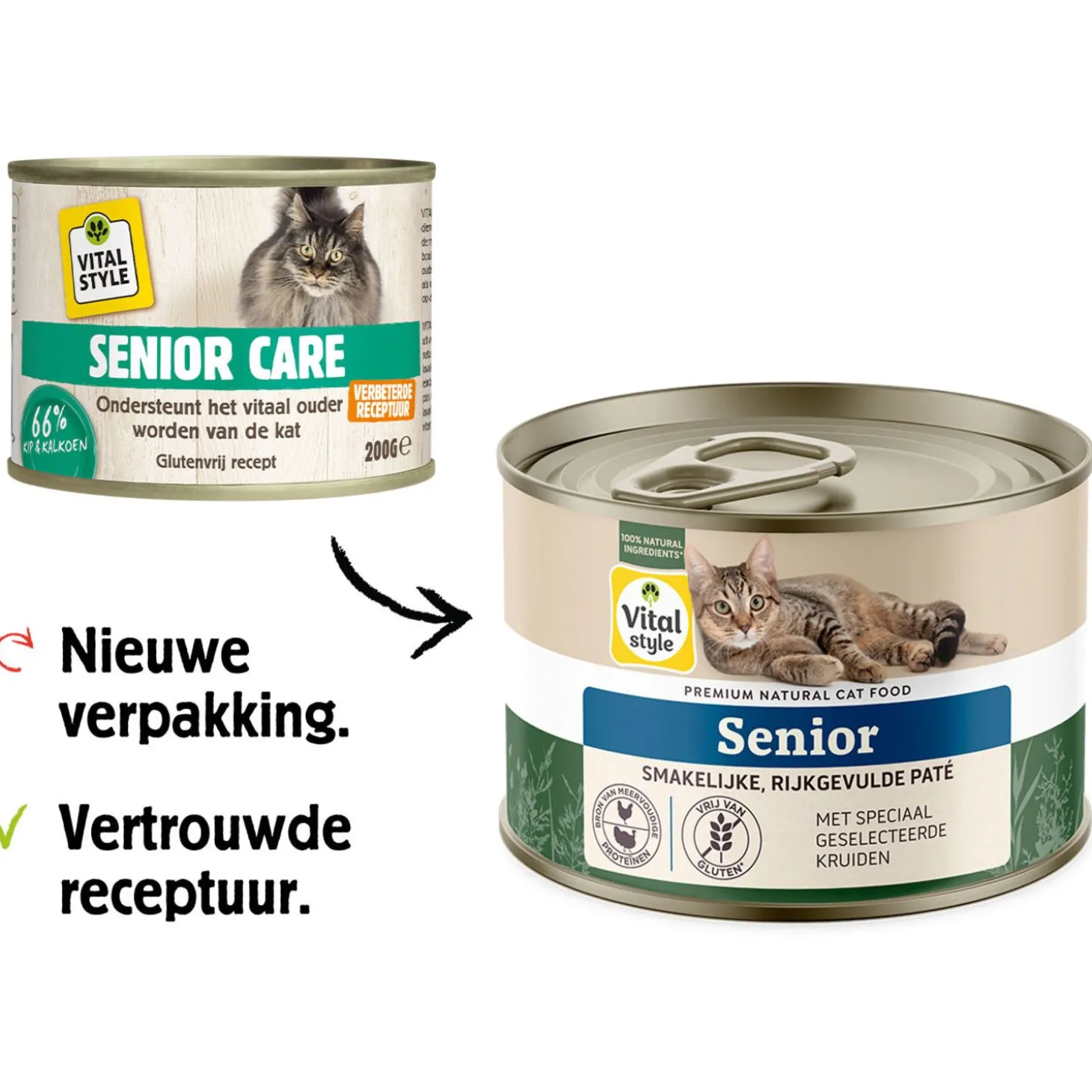 SENIOR CARE van VITALstyle is een heerlijke natvoeding voor oude(re) katten van alle rassen. Het natvoer bevat een uitgebalanceerde ingrediëntencombinatie met onder andere kip, kalkoen, bouillon en gezonde kruiden.