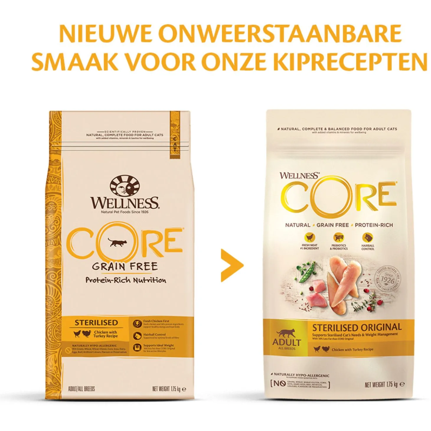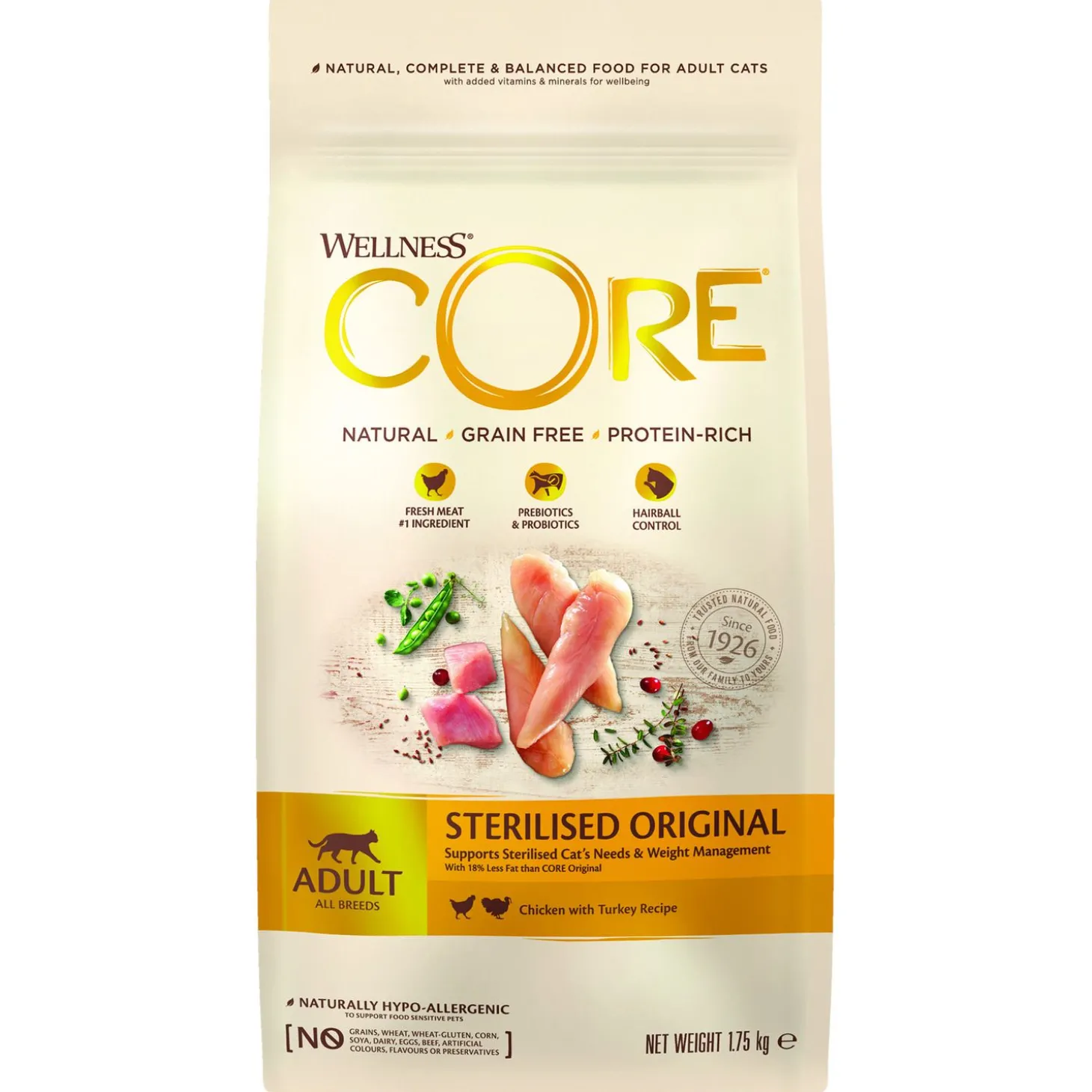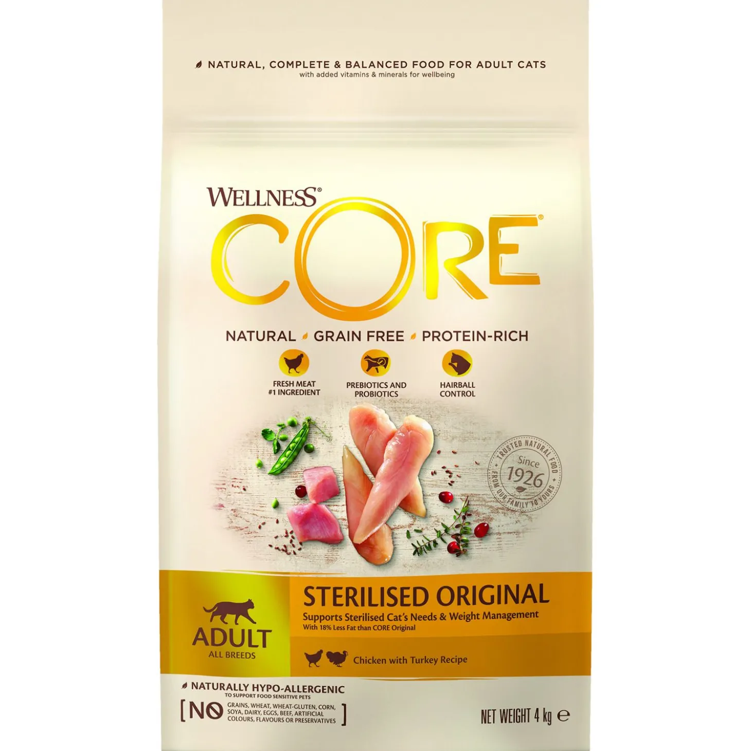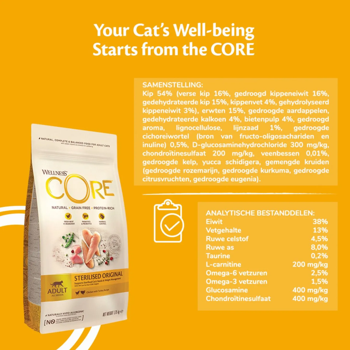Je wilt je kat natuurlijk de beste van de beste brokken aanbieden. Wellness Core Sterilised Kip is een natuurlijke en complete voeding voor gesteriliseerde/gecastreerde, volwassen katten, met toegevoegde vitaminen en mineralen. Een voeding rijk aan proteïnen met verse kip en kalkoen dat wordt aangevuld met onder andere gezonde groenten, superfoods, kruiden en voedingssupplementen. De voeding is daarnaast ook nog eens graanvrij.