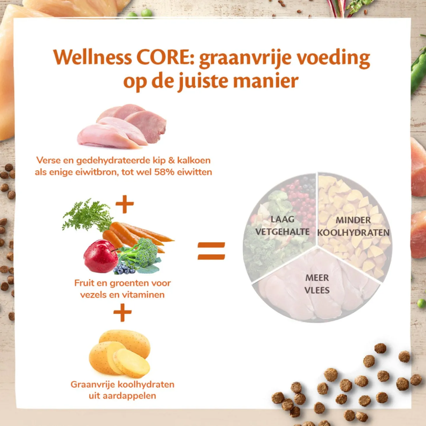 Bij Wellness Core is men ervan overtuigd dat het welzijn van je kat begint bij de juiste voeding. De recepten zijn gemaakt voor de carnivoor in je kat, zo wordt een evenwichtige voeding gecreëerd boordevol eiwitten van hoge kwaliteit, zonder granen en vulstoffen. Zo dragen alle Wellness Core-voedingen bij aan een optimale gezondheid, een gezond gewicht en een lang en gelukkig leven.