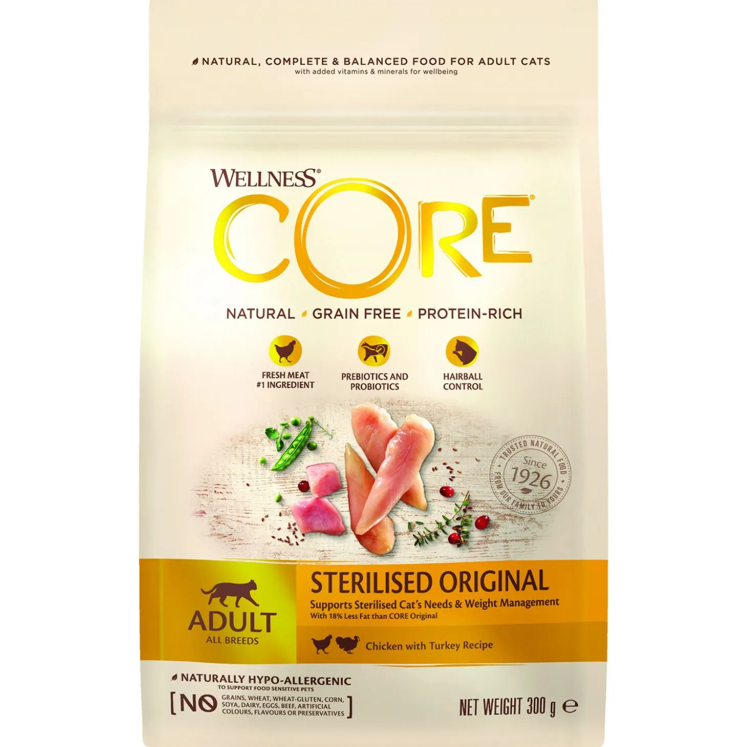Geholpen katten hebben een andere voedingsbehoefte dan intacte katten. Het optimale vezelgehalte in deze voeding zorgt ervoor dat je kat minder last krijgt van haarballen. Daarnaast bevat Sterilised 18% minder vet in vergelijking met Wellness Core Original zodat je geholpen kat op een gezond gewicht blijft.