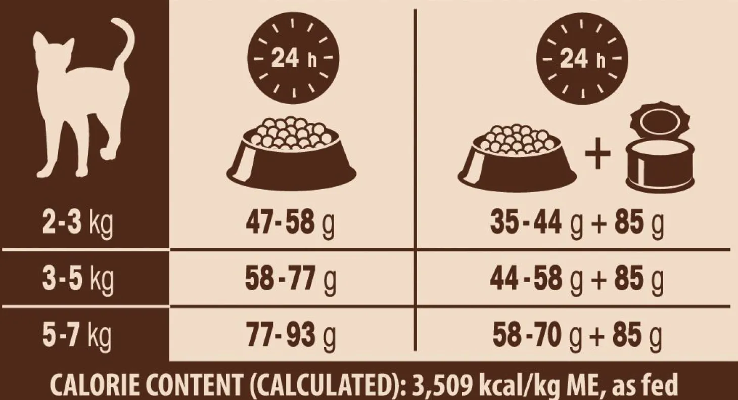 | Aanbeveling | VOEDINGSRICHTLIJNEN: Zie tabel. Deel het totaal aantal grammen per dag door het aantal keren dat u uw kat per dag voert. Gebruik de informatie alleen als een eerste aanbeveling en pas deze zo nodig aan. Bied altijd toegang tot schoon, vers water. KATTEN BOVEN DE 7 KG: Voeg 25 g toe per 1 kg extra gewicht.COMBINATIE VAN VOEDING: Als u met Wellness CORE nat voedsel voert, verminder de droge hoeveelheid met 19 g voor elke 80 g aan nat voer. CALORIEGEHALTE: 3562 Kcal/kg of 374 Kcal/Kopje ME (Metaboliseerbare Energie) |
