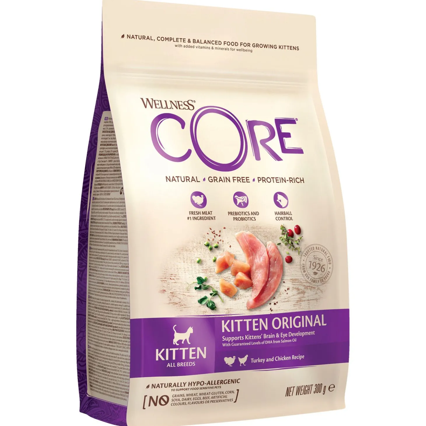 Wellness Core Kitten is volledig hypoallergeen, het bevat geen granen, tarwe, gluten maïs, soja, zuivel en ook geen kunstmatige geur-, kleur- en smaakstoffen. Een heerlijke vleesrijke maaltijd waar je kat volop van zal genieten.