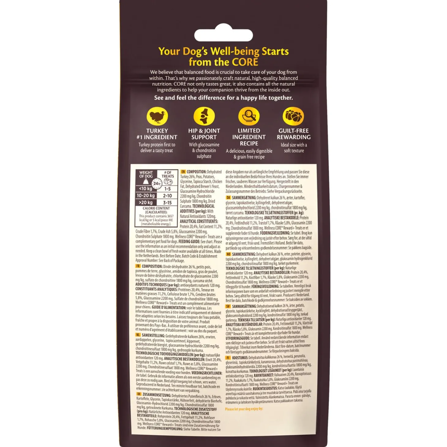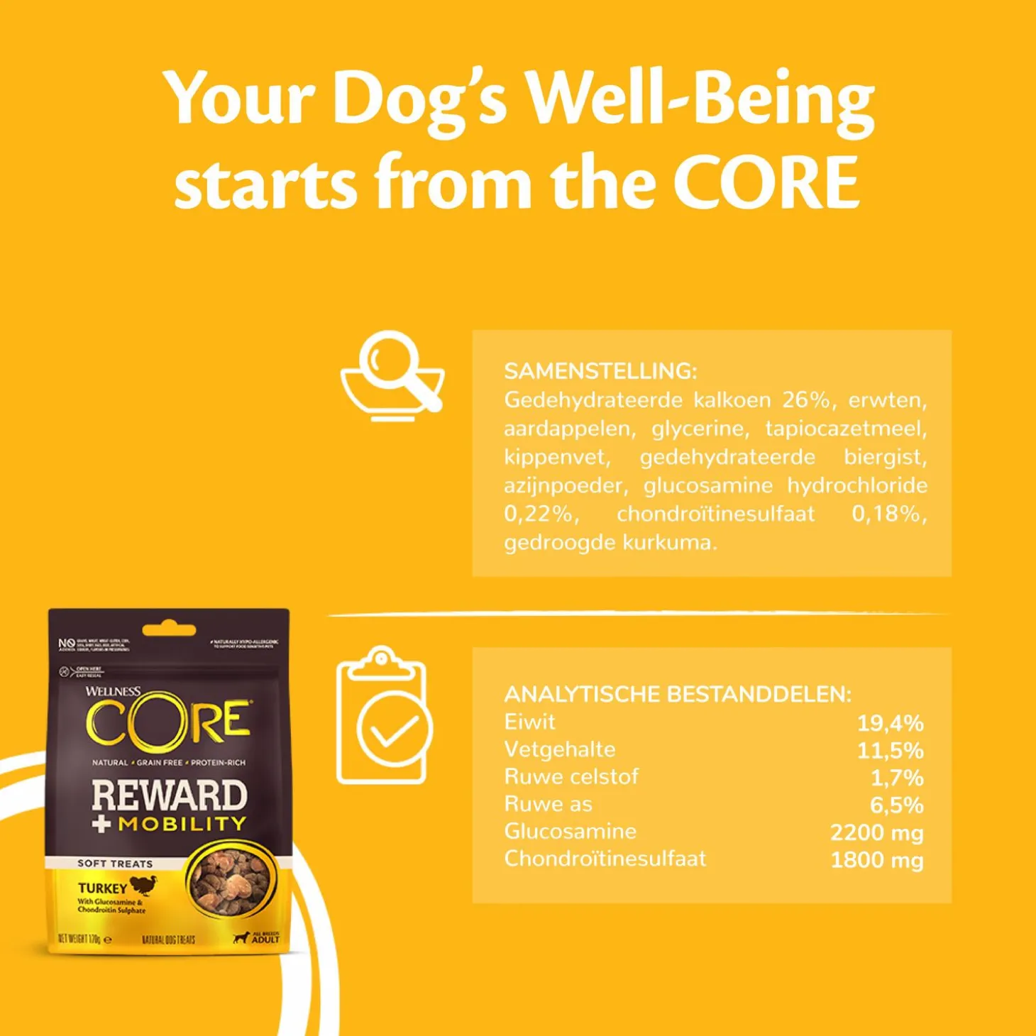 Net als bij de mens, zijn ook bij honden niet alle tussendoortjes even gezond. De Wellness Core Reward+ Mobility Treats zijn juist gemaakt met de gezondheid van je hond in het achterhoofd. De snacks zijn dus lekker én gezond, met hoge kwaliteit eiwitten, gezonde voedingsstoffen en superfoods.