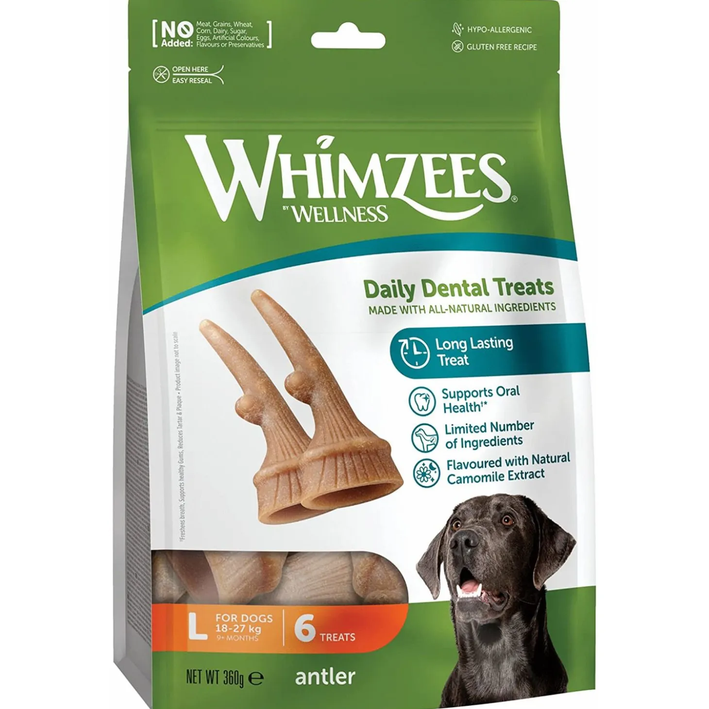 De unieke vorm van de Whimzees Antler zorgt voor extra uitdaging en kauwplezier. Je hond blijft langer kauwen wat nóg beter is voor het gebit. Daarnaast bevat de snack kamille extract voor een kalmerende werking.