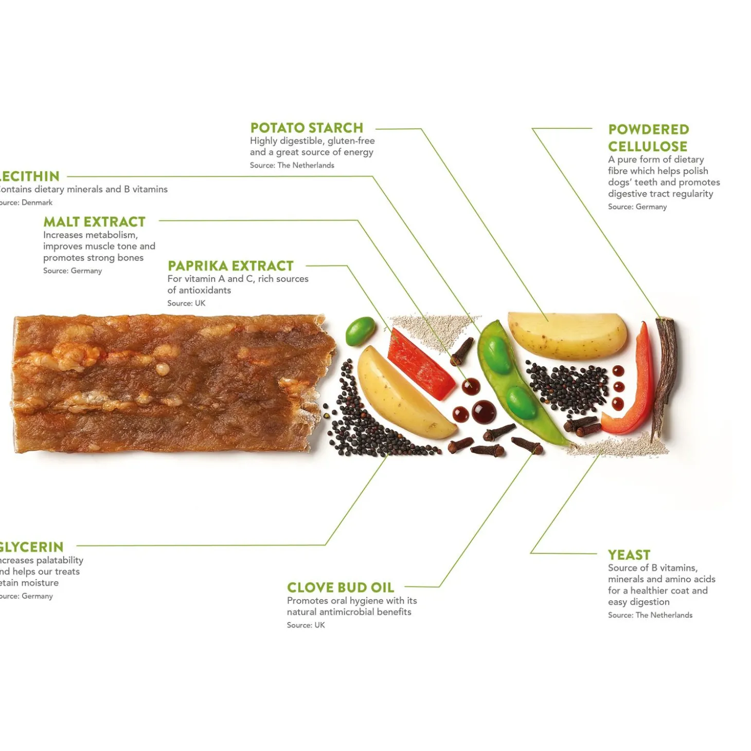 | Samenstelling | Aardappelzetmeel, glycerine, gepoederde cellulose, lecithine, gist, maltextract, zoete lupinemeel, kruidnagelolie, lycopeen (tomaat) |