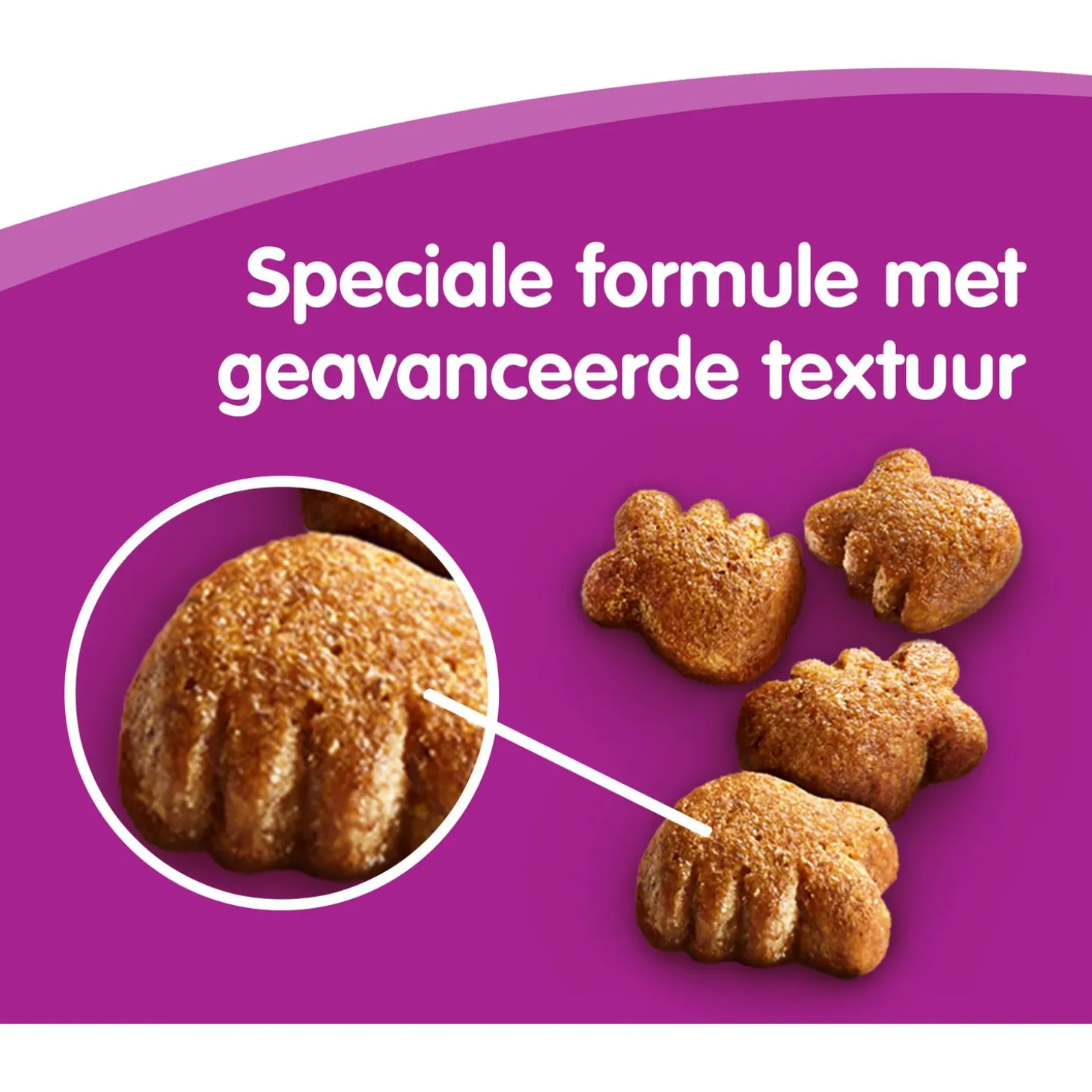 | Samenstelling | Samenstelling: granen, vlees en dierlijke bijproducten (waarvan kip 18%), plantaardige eiwitextracten, plantaardige bijproducten, oliën en vetten, mineralen, gist. |