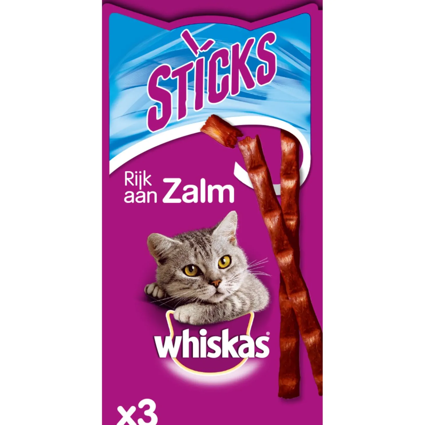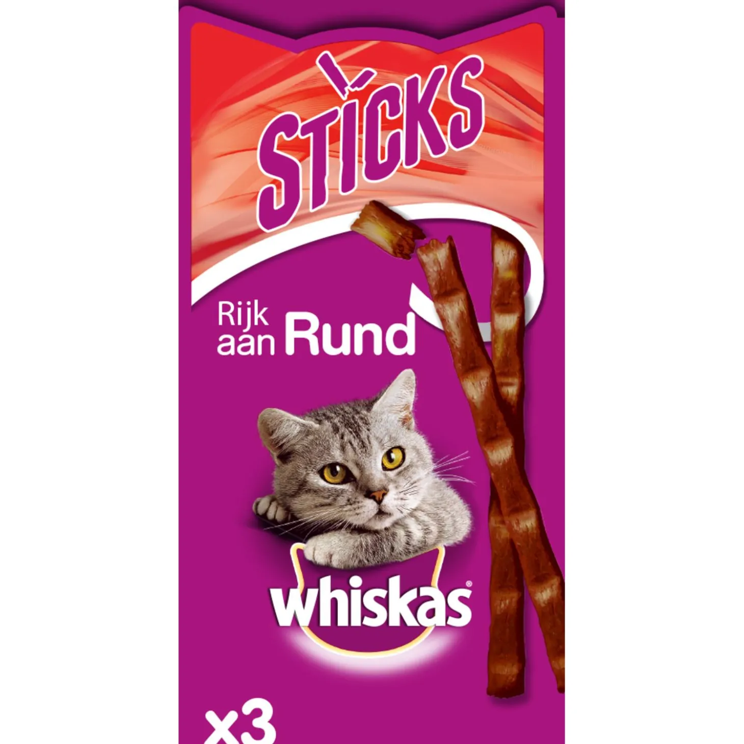 Whiskas Sticks bevat 18 g en is verkrijgbaar in de smaken kip, rund en zalm.